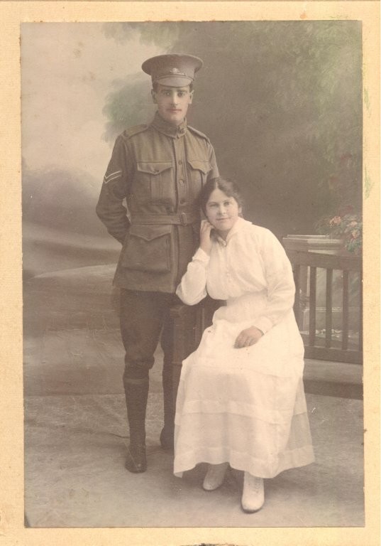 Hand-tinted studio portrait. Piercy in army uniform, with corporal's rank of two stripes. Wearing a peaked cap with rising sun badges on the cap and collar and Australia badges on his epaulettes, he and is standing next to his wife, Etta, who is sitting on a seat with slatted back. She is wearing a long-sleeved, long white frock with tight belt and white shoes and is holding Piercy's hand which is resting on her shoulder. In the background are studio props of balustrading, flowers and backdrop. Hand printed on the rear [Piercie Porter + wife/ Etta ( ????/ Brother of Ruth/ Jane Efford nee Porter].