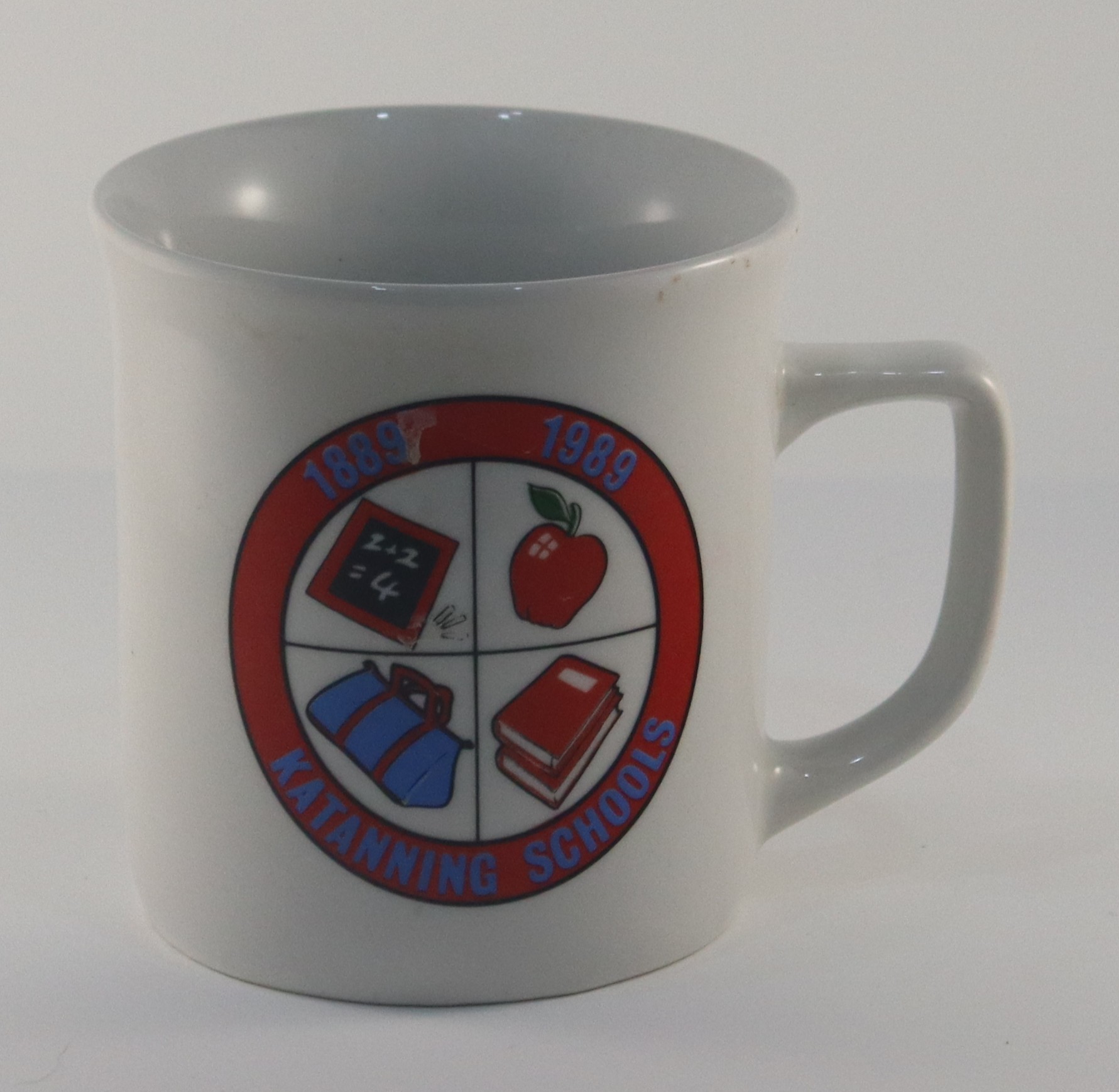 1889A white mug with a red circular picture on one side, the circle is divided into quarters, from the top left going clockwise is a picture of a; slate, red apple, blue and red bag and red books.