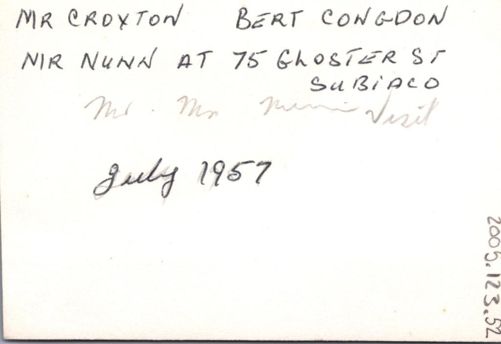 Reverse: Written in black pen, 'MR CROYTON, BERT CONGDON, MR NUNN AT 75 GLOSTER ST SUBIACO', 'JULY 1957'.