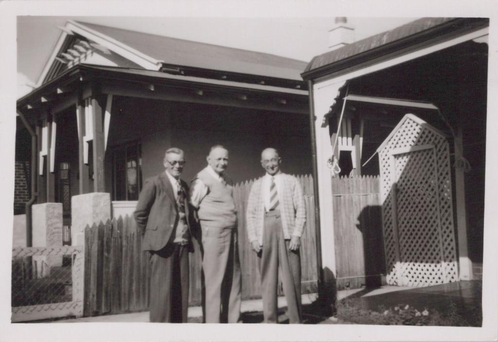 c. 1930Image: A photograph of Mr Croyton (left), Bert Congdon (centre) and Mr Nunn (right). They are standing infront of a wooden fence, and next to a wooden veranda of a house. My Croyton wears a white dress shirt under a dark suit, with dark framed glasses. Bert wears a white shirt under a light coloured vest, and long light coloured pants. Mr Nunn is wearing a white shirt underneath a light, checkered jacket, and a striped tie tucked into long light coloured pants.