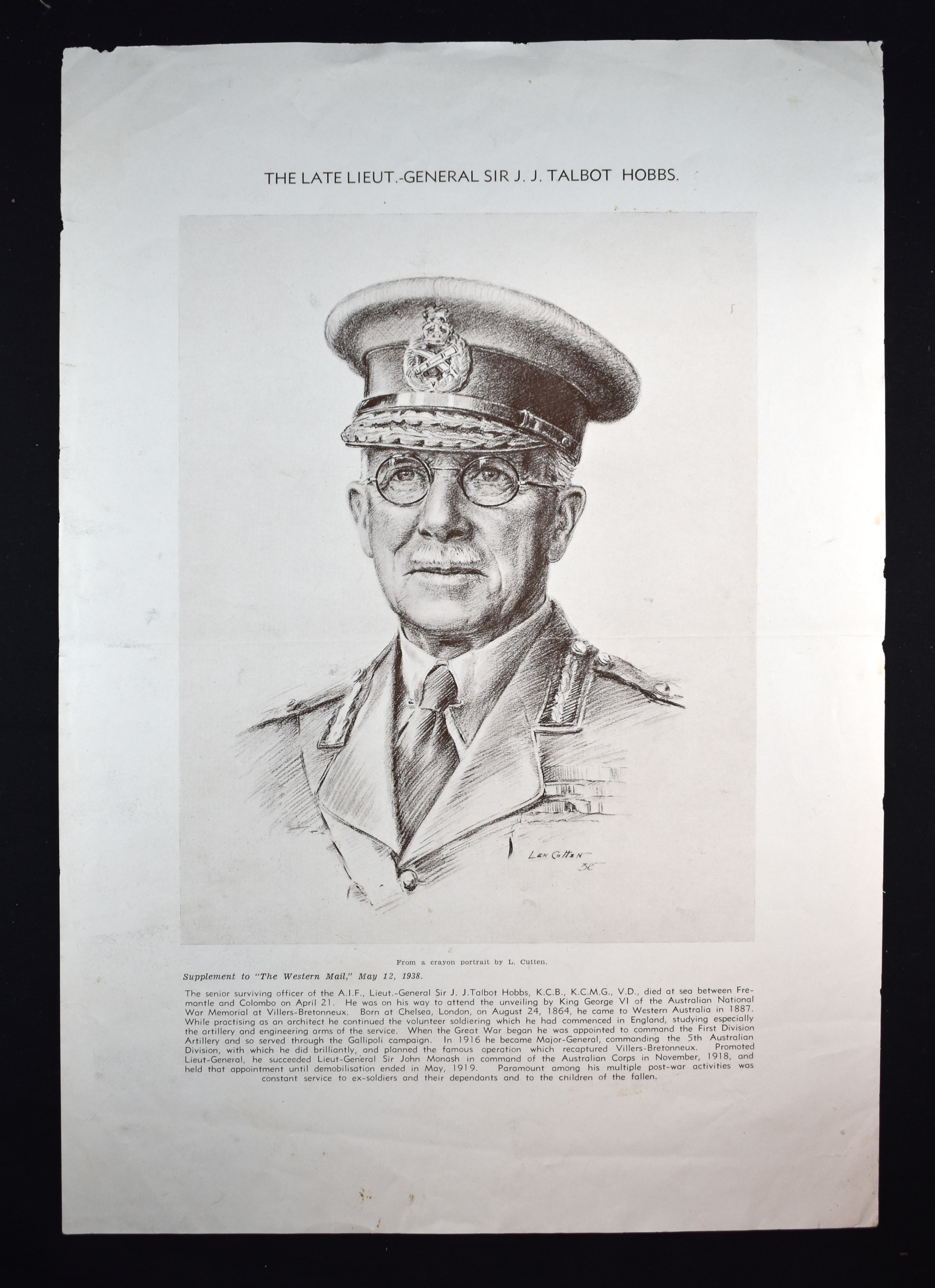 “THE LATE LIEUT.-GENERAL SIR J.J. TALBOT HOBBS. / From a crayon portrait by L. Cutten. / Supplement to “The Western Mail,” May 12,1938 / The senior surviving officer of the A.I.F., Lieut.-General Sir J.J. Talbot Hobbs, K.C.B., K.C.M.G., V.D., died at sea between Fre- / mantle and Columbo on April 21. He was on his way to attend the unveiling by King George VI of the Australian National / War Memorial at Villers-Bretonneux. Born at Chelsea, London, on August 24, 1864, he came to Western Australia in 1887. / While practising as an architect he continued the volunteer soldering which he had commenced in England, studying especially / the artillery and engineering arms of the service. When the Great War began he was appointed to command the First Division / Artillery and so served through the Gallipoli campaign. In 1916 he became Major – General, commanding the 5th Australian / Division, with which he did brilliantly, and planned the famous operation which recaptured Villers-Bretonneux. Promoted / Lieut-General, he succeeded Lieut-General Sir John Monash in command of the Australian Corps in November, 1918, and / held that appointment until demobilsation ended in May 1919. Paramount among his multiple post-war activities was / constant service to ex-soldiers and their dependants and to the children of the fallen."