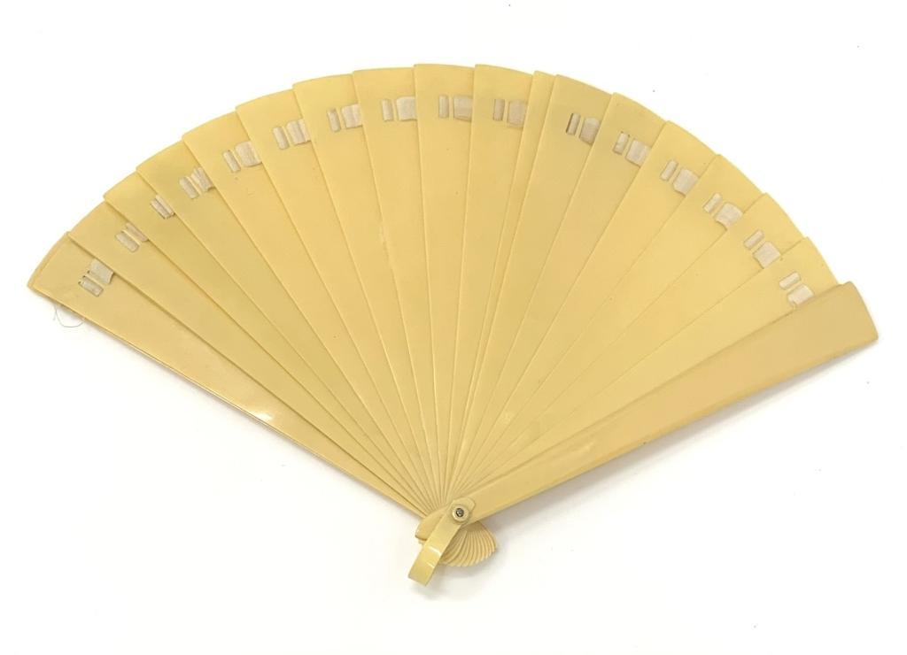 FAN: CELLULOID HAND FAN WITH SILK RIBBON INTERLACING AND TRIM AT HANDLE
