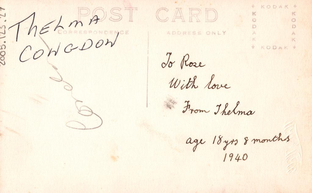Reverse: Handwritten in black pen is 'THELMA CONGDON' and 'To Rose. With love. From Thelma. Age 18yrs 8 months 1940'.