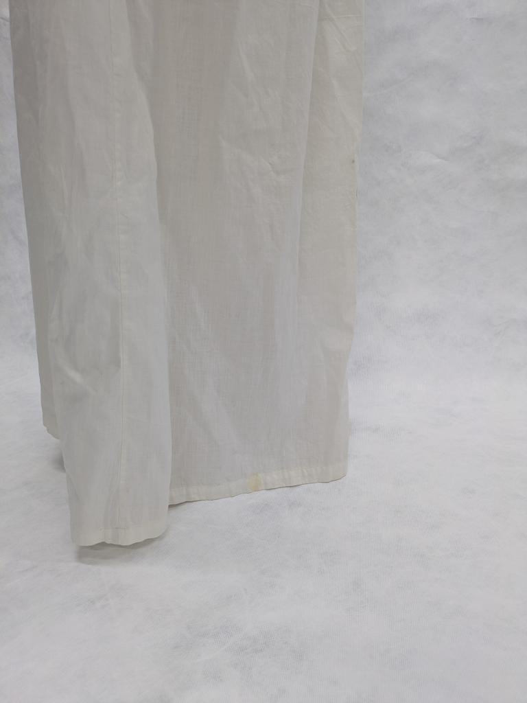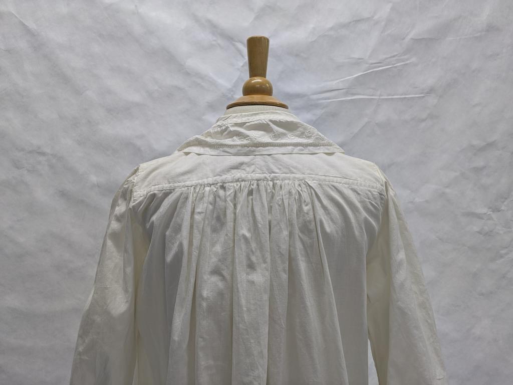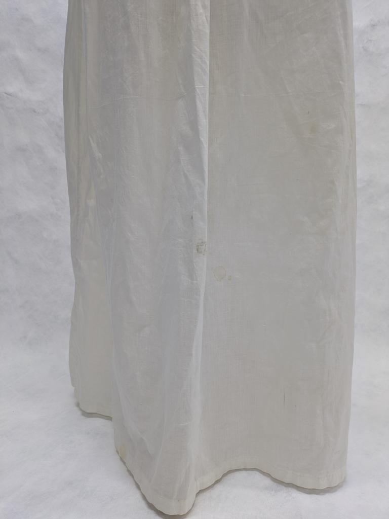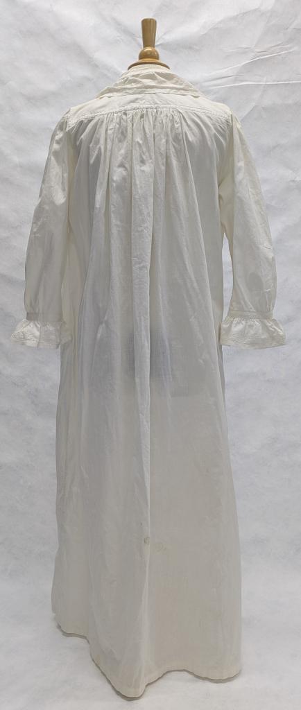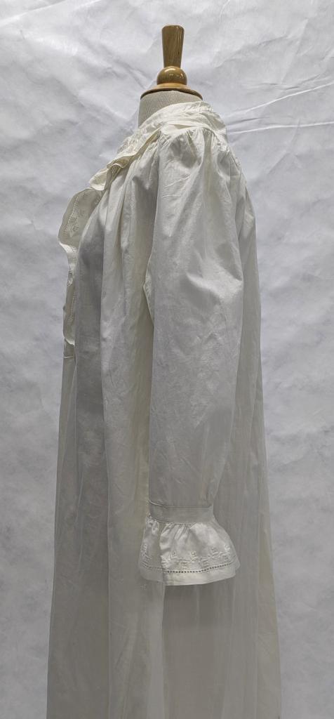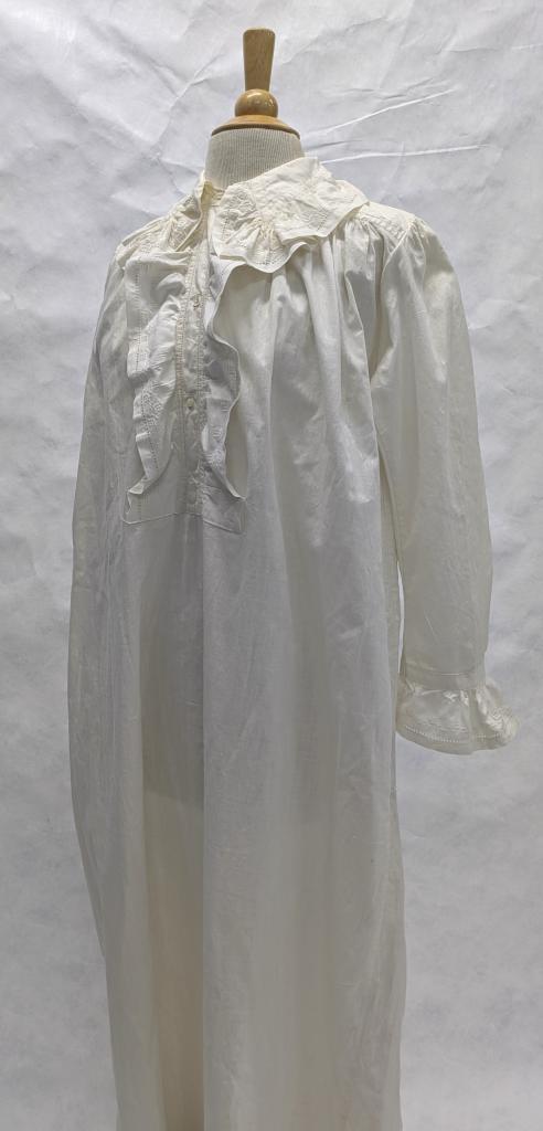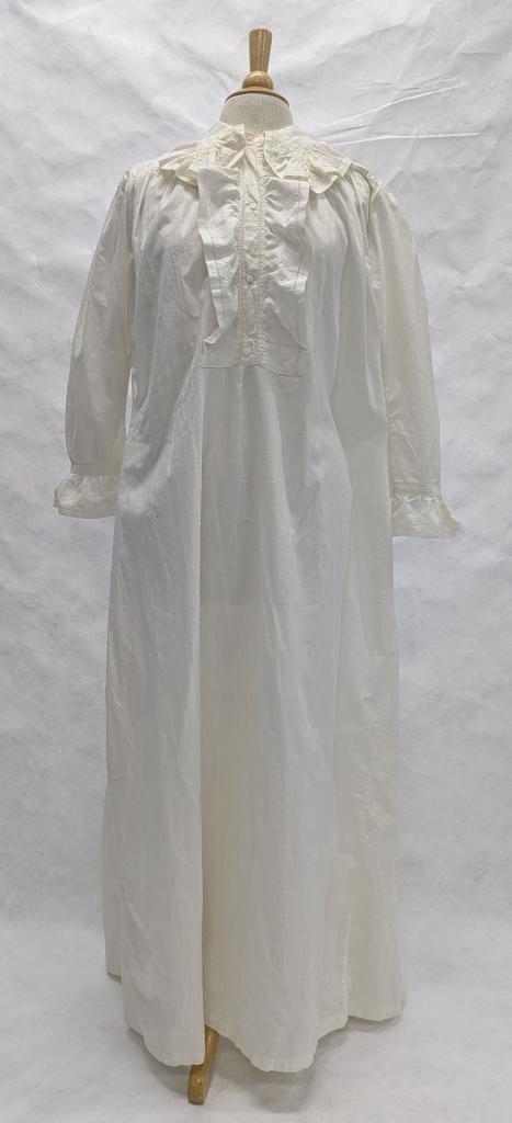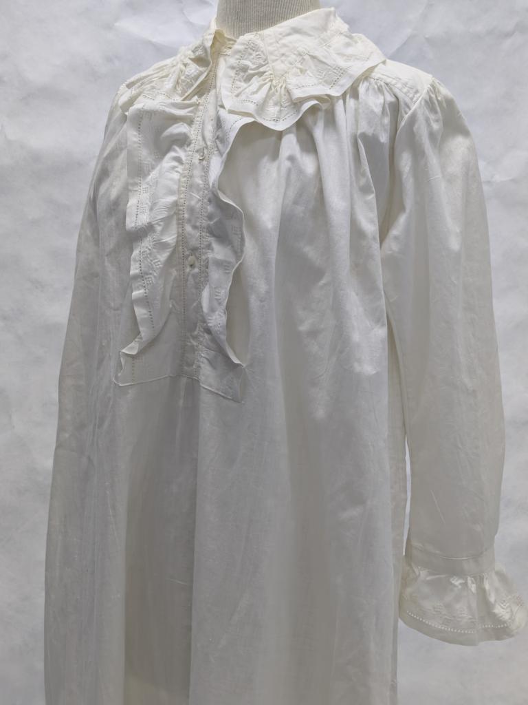 c. 1930Nightdress - white, full length long sleeves. Peaked collars, trimmed with wide frill of embroidered cotton. Two rows of frilled embroidered cotton down each side of front openings and also on sleeve cuffs. Front opening - 3 pearl buttons.