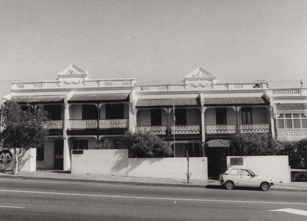 1985Black and white photograph of houses at 15-21 Hay Street. The houses are connected. The houses are two story houses. There are two small gables on top of the roof. There is an archiological ornament placed on the wall beneath each gable. There is a decorative low wall on top of the roof, extending past the gables. The second floor of the houses has balconies with a decorative fence. The first floor has verandahs. There is a white brick wall in front of the houses with two openings. Each opening is leading to the main entrance of a house. There is a car parked on the side of the road in front of the house to the right. The number '19' is seen on the brick wall to the left of the car. There are some trees and bushes in the image.