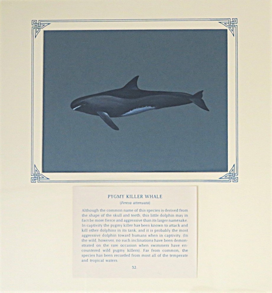 Although the common name of this species is derived from the shape of the skull and teeth, this little dolphin may in fact be more fierce and aggressive than its larger namesake. In captivity the pygmy killer has been known to attack and kill other dolphins in its tank, and it is probably the most aggressive dolphin toward humans when in captivity. (In the wild, however, no such inclinations have been demonstrated on the rare occasion when swimmers have encountered wild pygmy killers). Far from common, the species has been recorded from most all of the temperate and tropical waters.