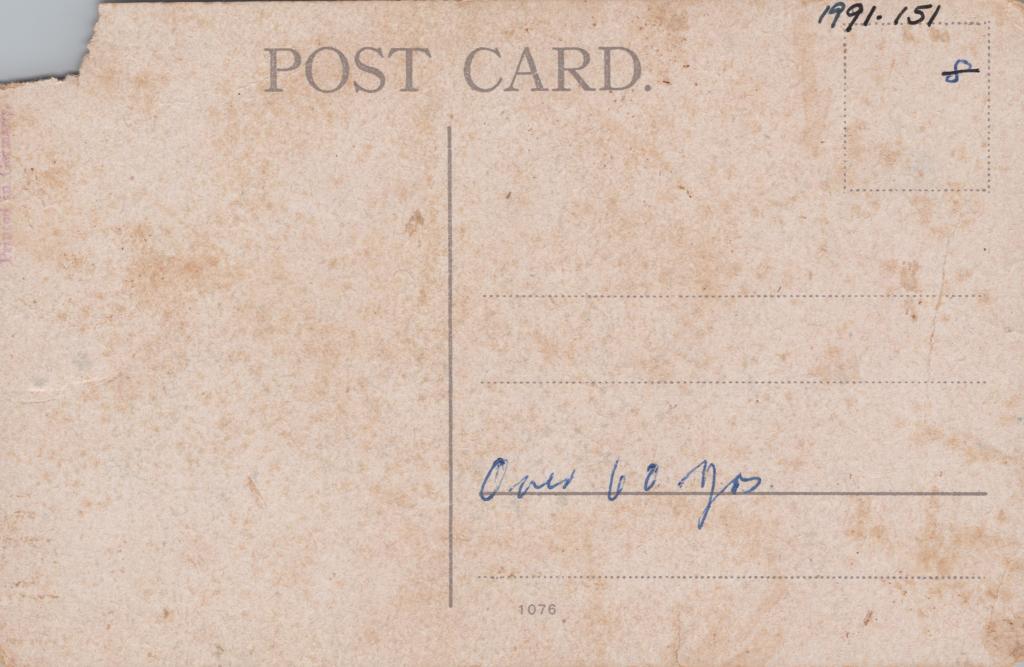 c. 1910Coloured postcard depicting a young lady sitting on a low garden wall with trees in the background. She wears a long dress with a stole draped over her shoulders. With her left hand she plucks petals off a bunch of roses held in her right hand. The following lines are printed in red across the top of the card: 'She plucks the leaves off, one by one and murmurs soft and low - He loves me, not, a little, much but passionately, Ah no.' On the reverse the donor has written in ink: 'Over 60 years.'