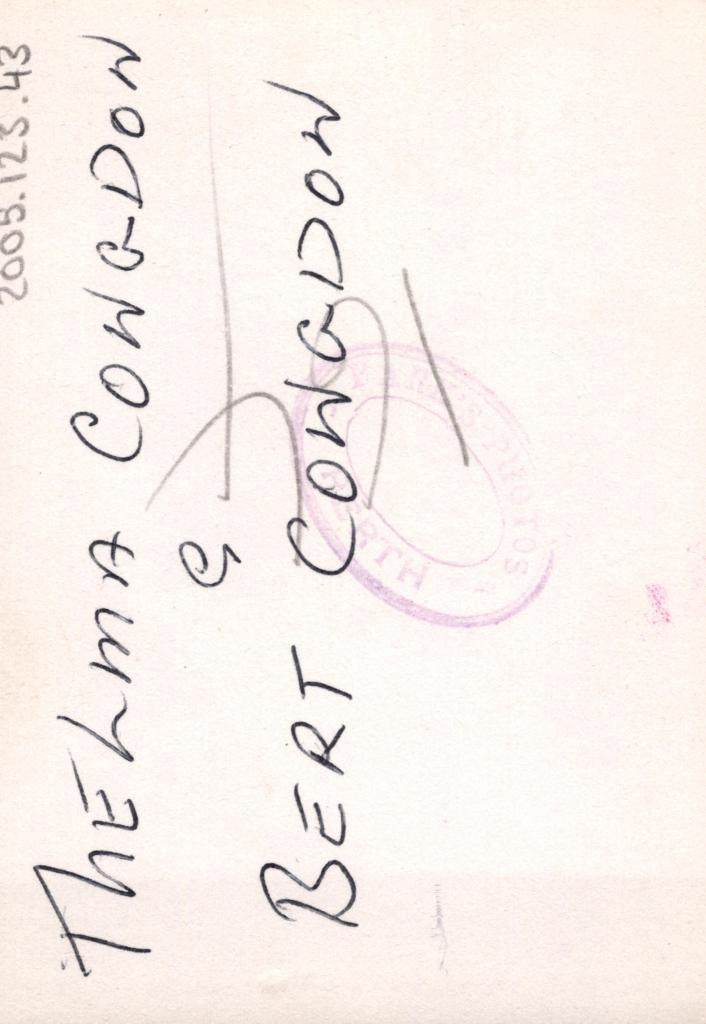 Reverse: Written in black pen is 'THELMA CONGDON & BERT CONGDON'. There is a purple stamp, 'PARK'S PHOTOS PERTH'.