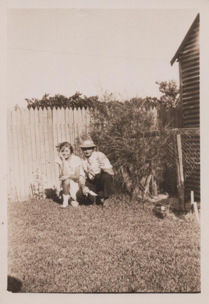 c. 1930Image: A photograph of Thelma Congdon (left) and Bert Congdon (right) kneeling on grass next to eachother. Thelma is wearing a white dress, with white socks and enclosed shoes. Bert is wearing a write dress shirt, with a patterned tie, and dark pants. Behind them on the left is a wooden fence, while on the rights there is a shrub, a wire fence, and what appears to be a wooden building.
