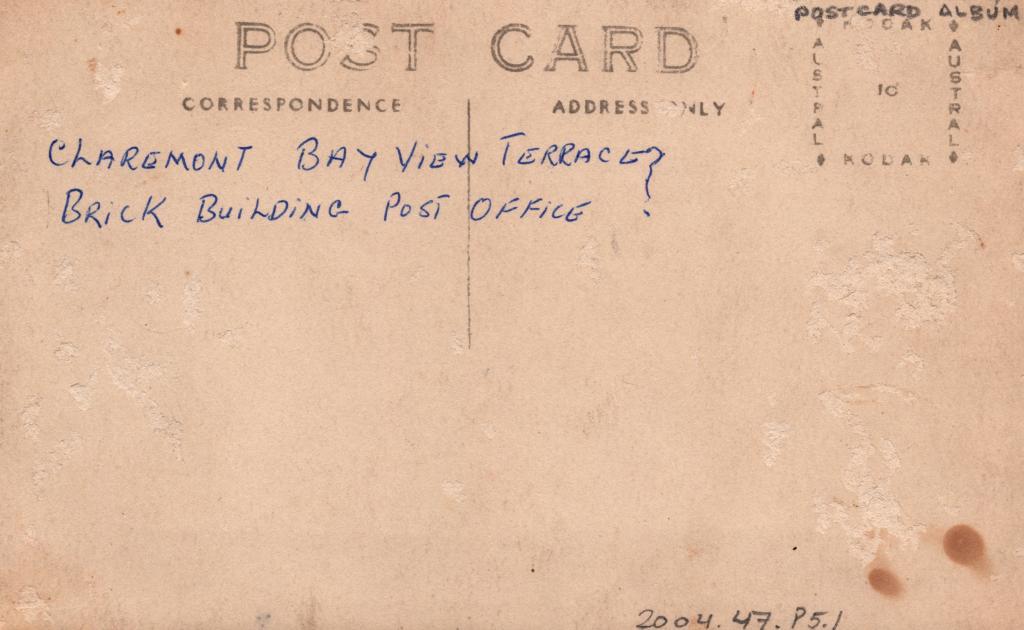 Reverse: Written in blue pen: 'CLAREMONT BAY VIEW TERRACE ? BRICK BUILDING POST OFFICE'