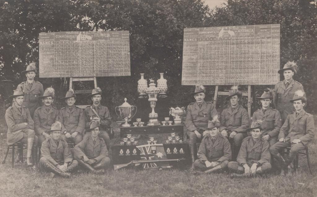c. 1913Postcard showing a group of people, all males. Trophies are seen in the middle of the image. Scoreboards are seen behind the people. Trees are seen in the background.
