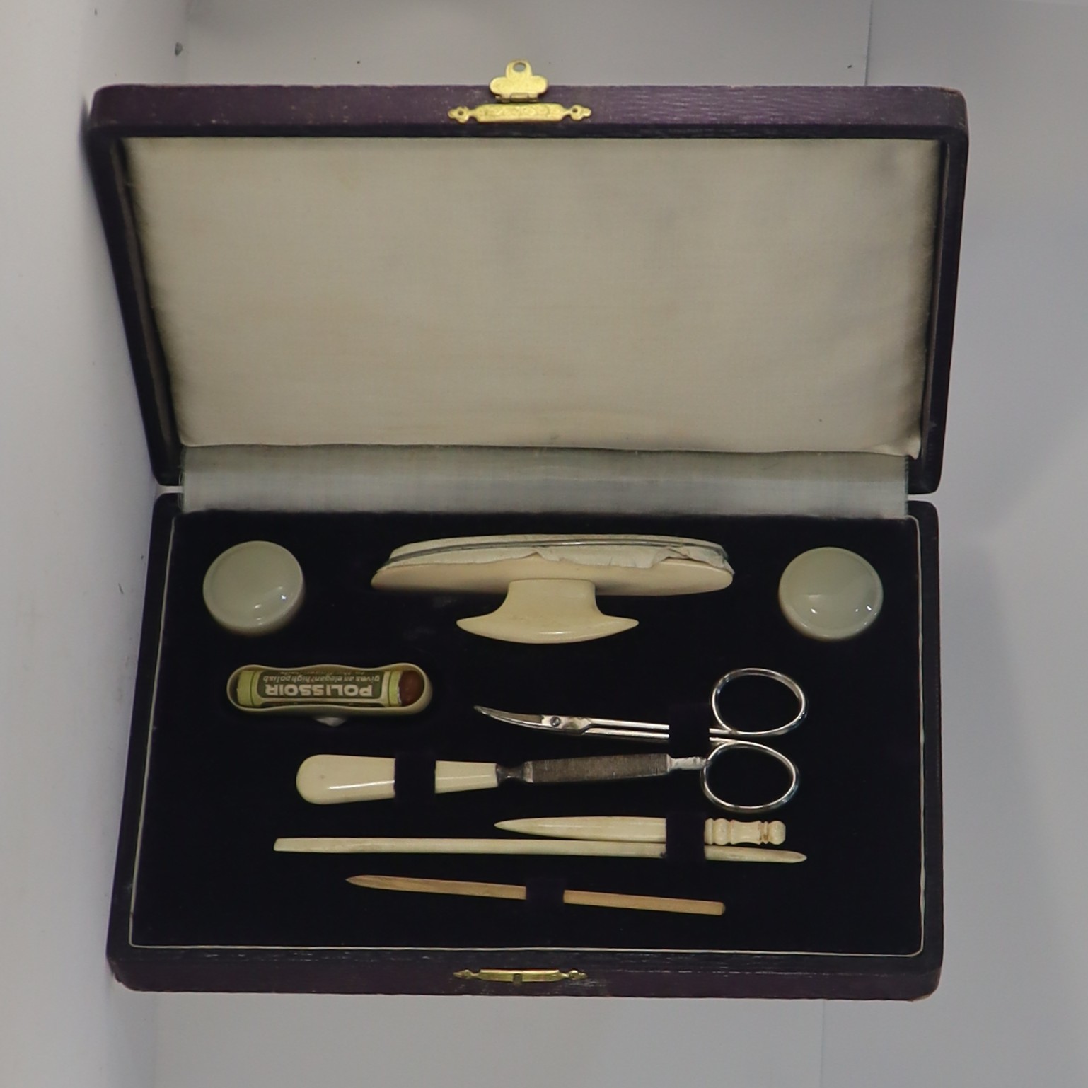 c. 1850 - 1940A ladies manicure set in a wooden box with a clip. Inside the box are a nail polisher; nail polish stick, scissors, a nail file. The items have pale yellow plastic handles.