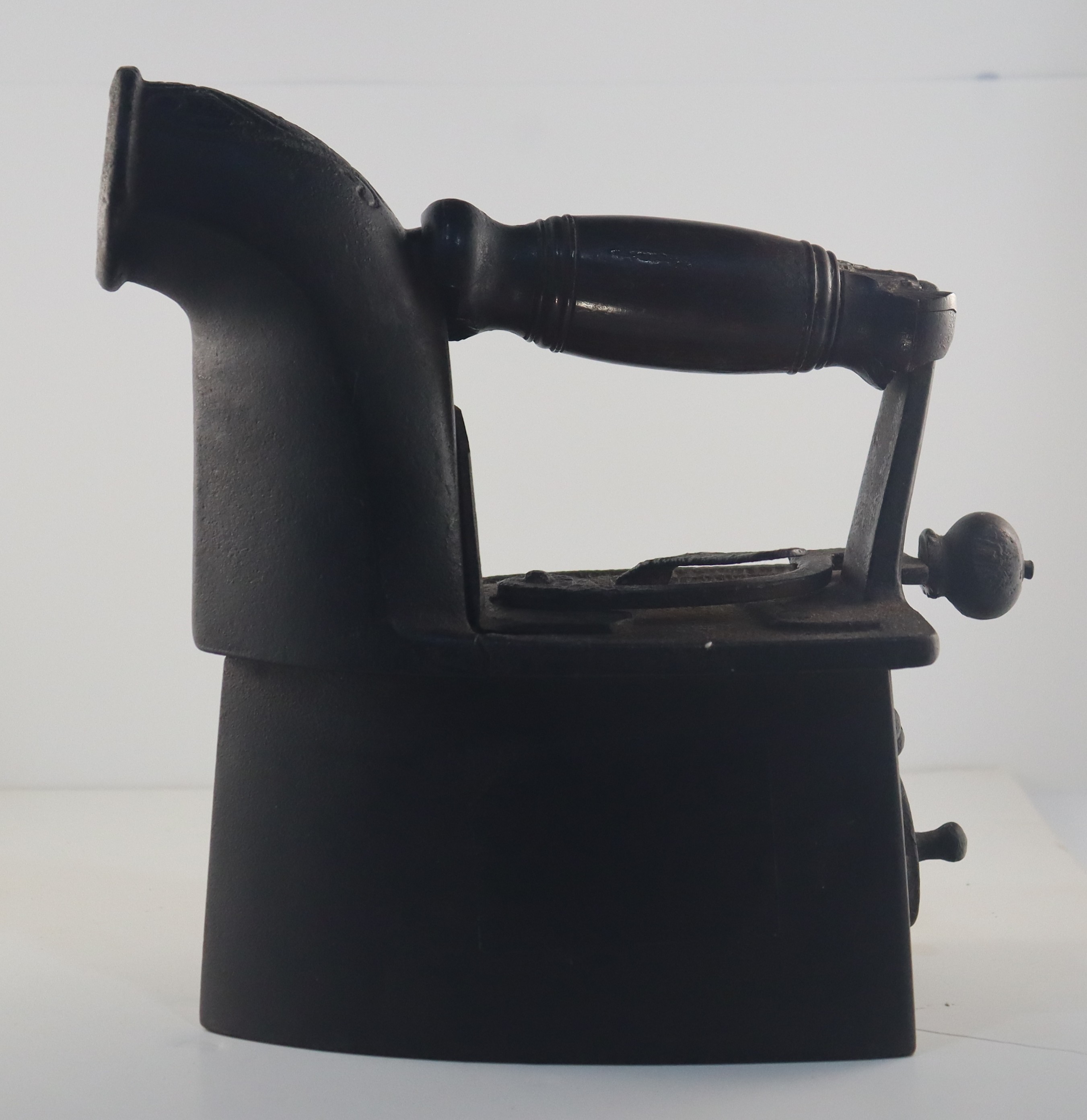 c. 1884A hollow iron that has a funnel at the front and a lever on the top of the iron to open the lid. It has a wooden handle and a scroll pattern on the top of the funnel.
