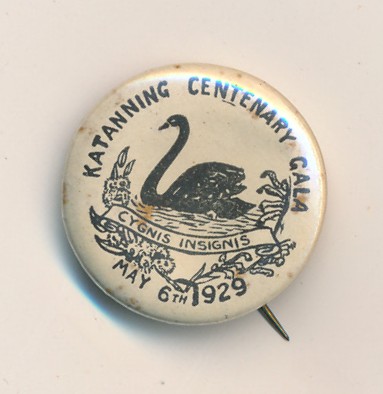 Around the top edge of the badge in black lettering is "KATANNING CENTENARY GALA" and at the bottom is "MAY 6TH 1929". Underneath the swan is a scroll with the words "CYGNIS INSIGNIS" in black lett