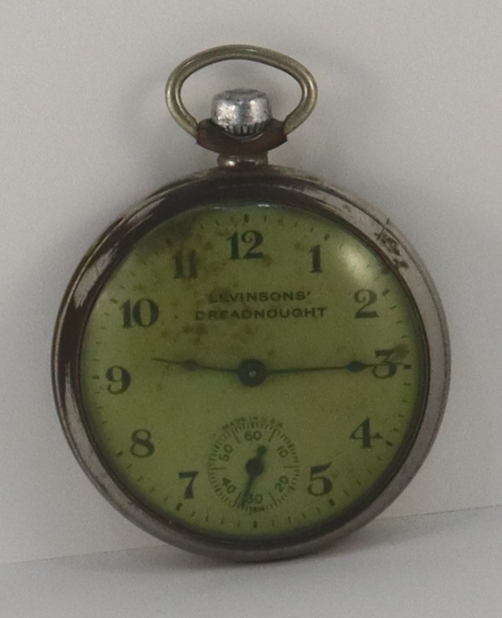 On the back of the pocket watch is an oval shaped circular with the words "LEVINSON & SONS DREADNOUGHT" around the inner oval and in the centre is a engraved picture of a steam ship"