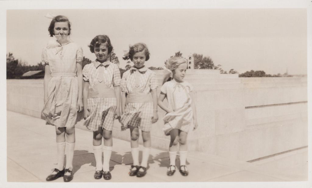 c. 1910Image: A photograph of four young girls standing next to eachother. The girls are wearing checkered dresses, with white socks and black enclosed shoes. Three of the girls have the same short dark hair, while the youngest has longer blond hair.
