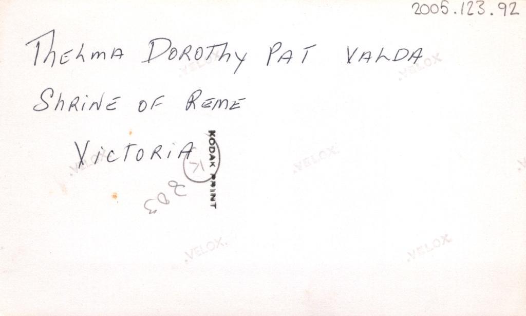 Reverse: Written in black pen, 'THELMA, DOROTHY, PAT, VALDA', 'SHRINE OF REME', 'VICTORIA'.