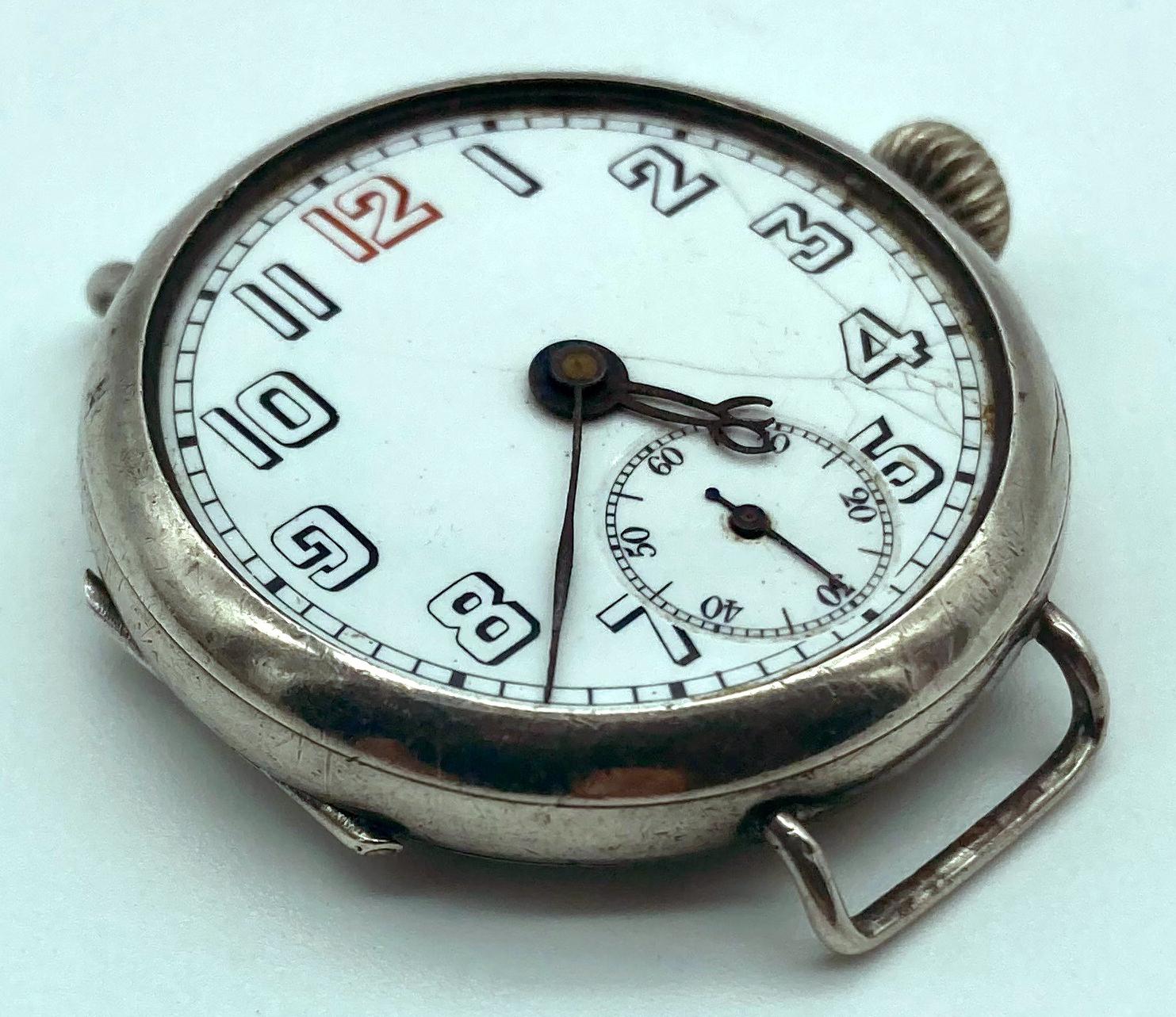 c. 1915Swiss made, silver cased, sidewinder trench watch presented to Ernest Allen Ernst. It is engraved on the reverse in cursive writing with his surname, initials and service number.