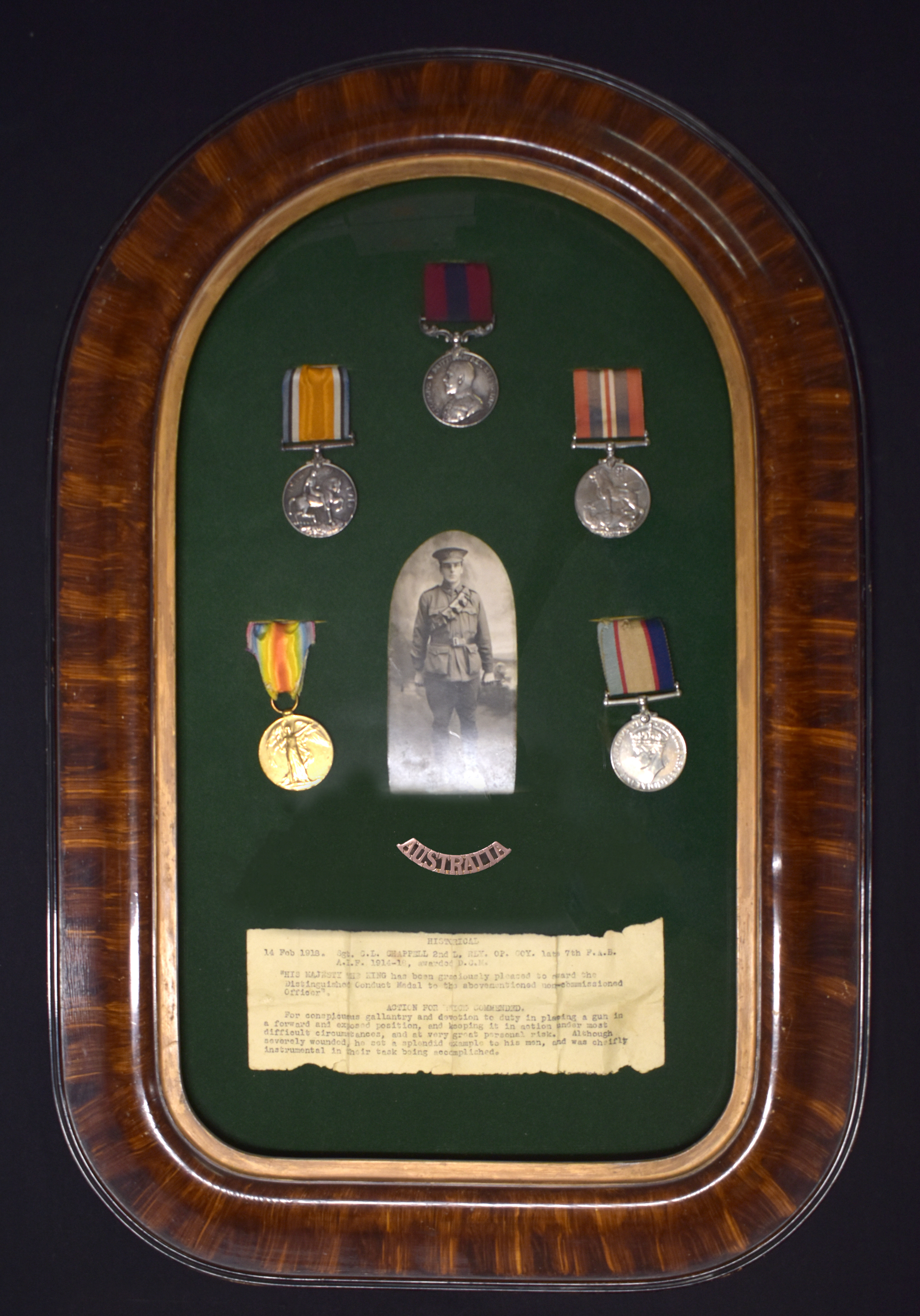 On 2016.3.1.h "HISTORICAL / 14 Feb 1918. Sgt. C.L. CHAPPEL 2nd L. RLY. OP. COY. late 7th F.A.B. / A.I.F. 1914-18, awarded D.C.M. / “HIS MAJEXTY THE KING has been graciously pleased to award the / Distinguished Conduct Medal to the abovementioned non-commissioned / Officer” / ACTION FOR WHICH COMMENDED / For conspicuous gallantry and devotion to duty in placing a gun in / a forward and exposed position, and keeping it in action under most / difficult circumstances, and at very great personal risk. Although / severely wounded, he set a splendid example to his men, and was cheifly / instrumental in their task being accomplished.”
