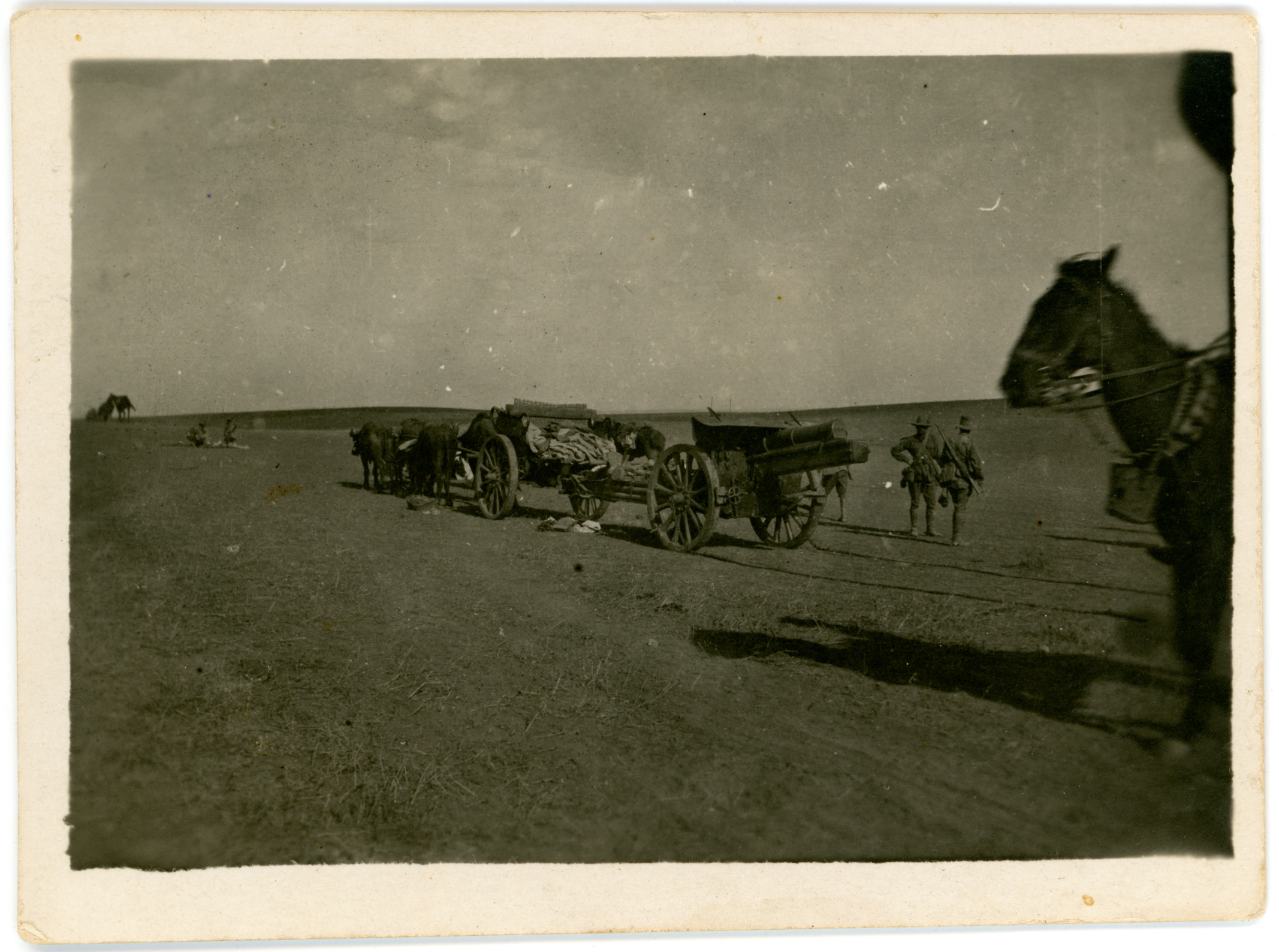 1915 - 1919A small black and white photograph showing a large wooden gun carriage that has been captured by troopers. The 4 wheeled carriage has its gun and shield at the rear and various items including fabric towards the front of the carriage. The wheels are spoked with iron rims and there are chains attached to the 2 rear wheels that trail behind the carriage. The carriage is pulled by 4 oxen. There are three troopers standing close to the carriage and another man is mounted with his horses head visible on the right-hand side of the image. Further away are two other troopers examining something on the ground with their horses in the distance. The terrain is bare with just a small hill in the background. The reverse of the image has the proforma printing of part of a postcard and an inscription describing the image. The photograph has a small border and overall is in good condition.
