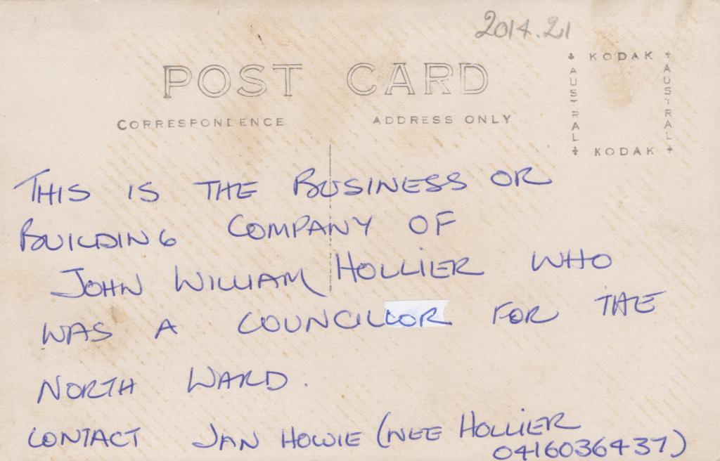 On the reverse is printed 'POST CARD / CORRESPONDENCE / ADDRESS ONLY' and the four sides of a space to place a stand has 'KODAK' top and bottom of the rectangle, and 'AUSTRALIA' on both sides. Written on the back in blue ballpoint is 'THIS IS THE BUSINESS OR / BUILDING COMPANY OF / JOHN WILLIAM HOLLIER WHO / WAS A COUNCILLOR FOR THE / NORTH WARD. / CONTACT JAN HOWIE (NEE HOLLIER / 0416036437). Broken diagonal stripes running top to bottom and left to right over most of the reverse.
