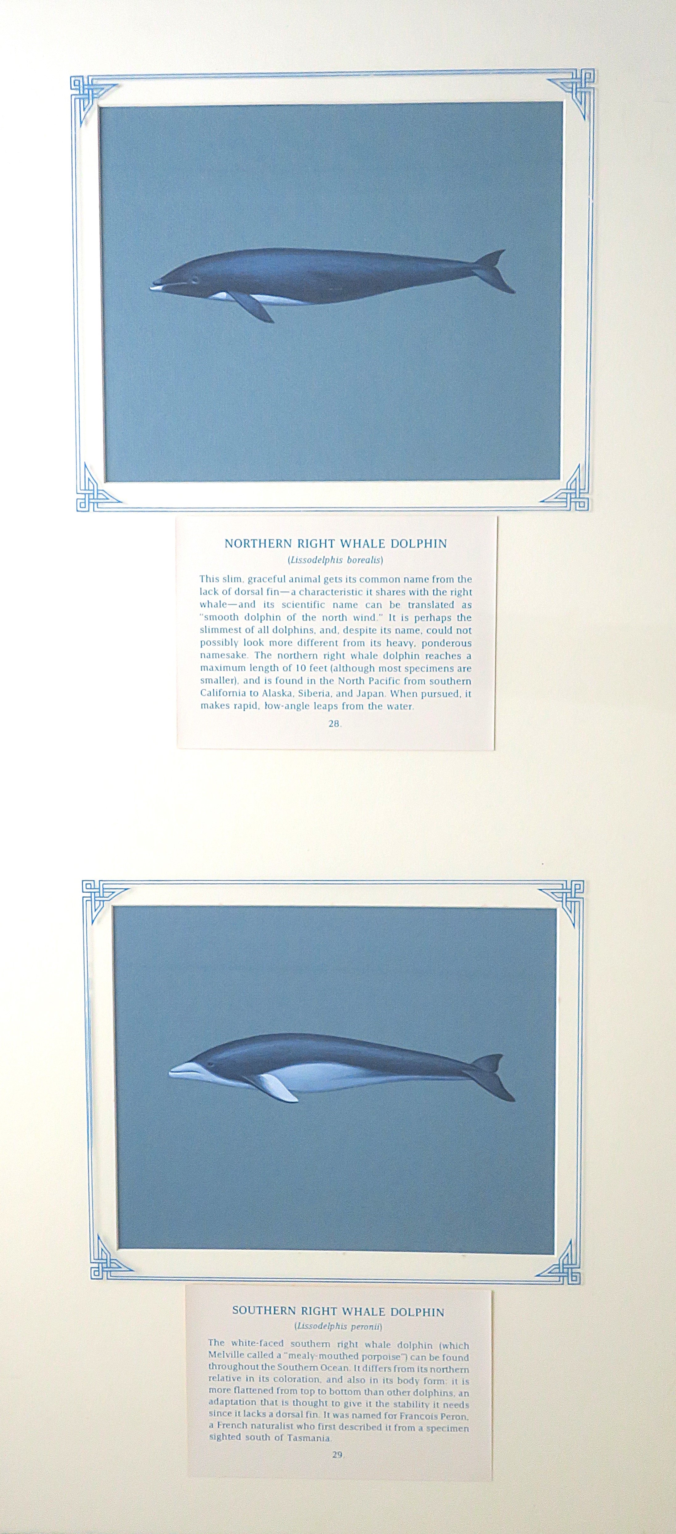 c. 19752 paintings in single framed work (a) Northern Right Whale Dolphin - slender, black with distinctive white underside and bottom lip, streamlined with no dorsal fin (28) (b) Southern Right Whale Dolphin - slender with two-tone coloration: black on top, white lower half, white beak and lower fin, and no dorsal fin (29.); gouache on blue card, framed and mounted with inscription