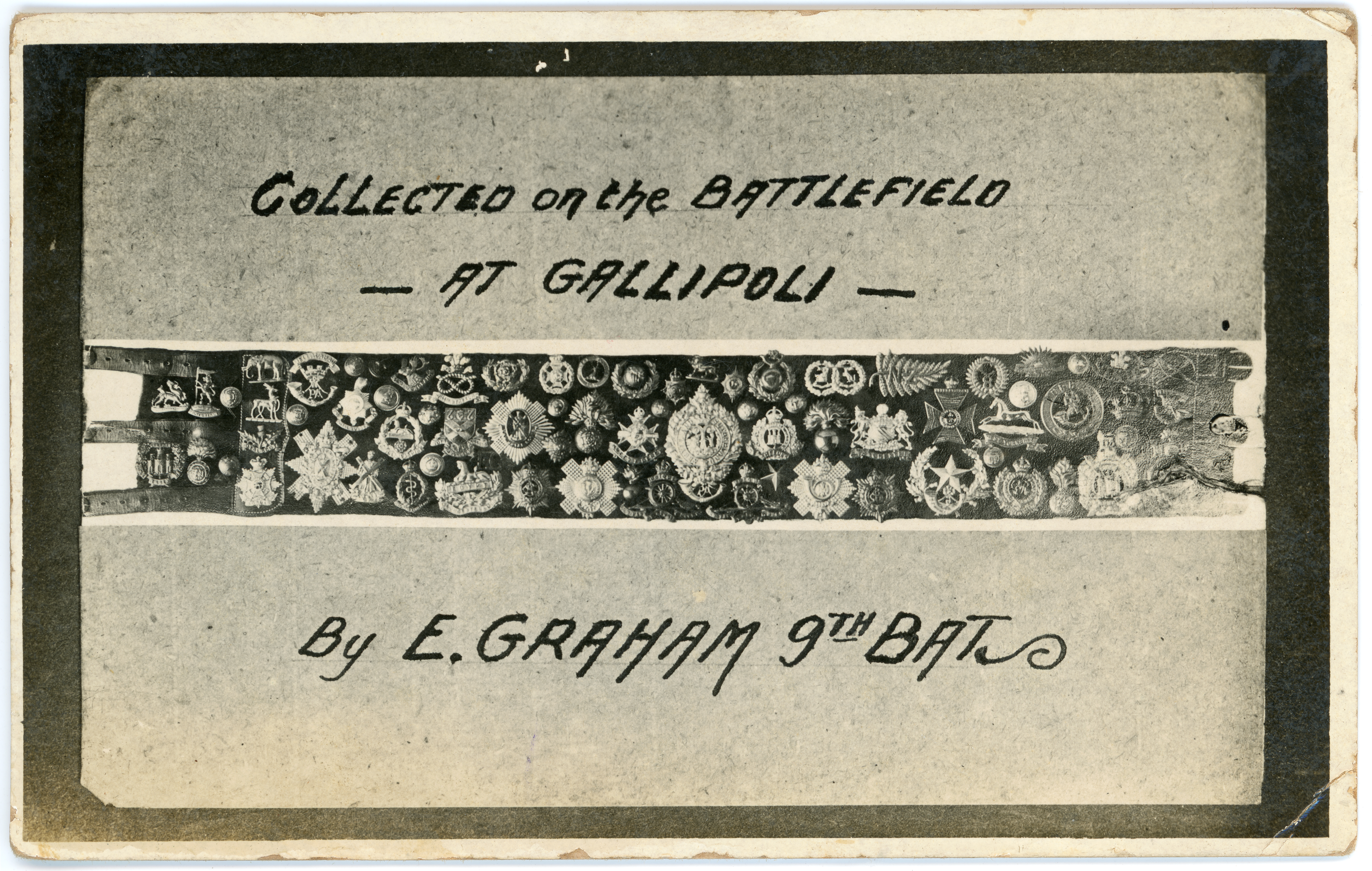 The postcard depicts a belt with a large number of military badges and buttons collected on the Gallipoli Battlefield. It was common practice for soldiers to collect souvenirs to commemorate their service. Postcard is inscribed with, "Collected on the Battlefield / - at Gallipoli - / By E.GRAHAM 9th Bat". Private Edward GRAHAM, regimental 714, enlisted 01/09/1914 and was with the 9th Battalion, F Company. He returned to Australia 27/06/1919.
