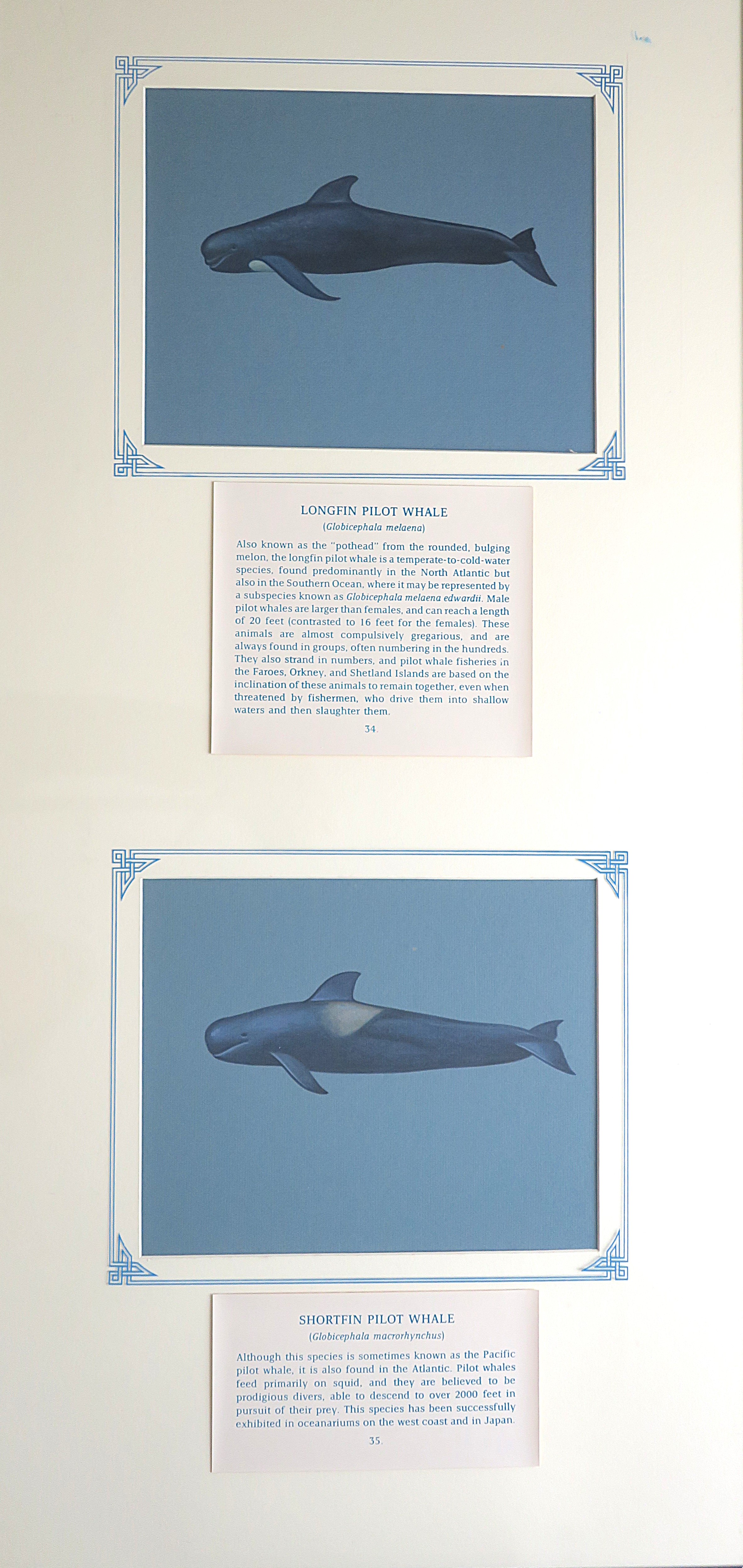 c. 1975Paintings of (a) Longfin Pilot Whale - black with lighter grey marking under fin, a blunt, bulbous head with pronounced upper lip and shortened beak, with long, sickle-shaped dorsal fin (34) (b) Shortfin Pilot Whale - black with lighter grey saddle marking near long, sickle-shaped dorsal fin, a blunt, bulbous head and shortened beak (35.); gouache on blue card, framed and mounted with inscription