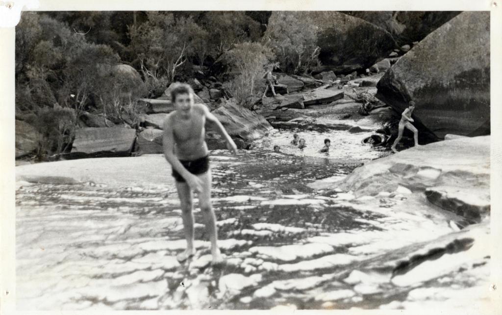 Black and white photograph: Alan Miller trying to walk up the natural rock slide. Other scouts in water and on waters edge.