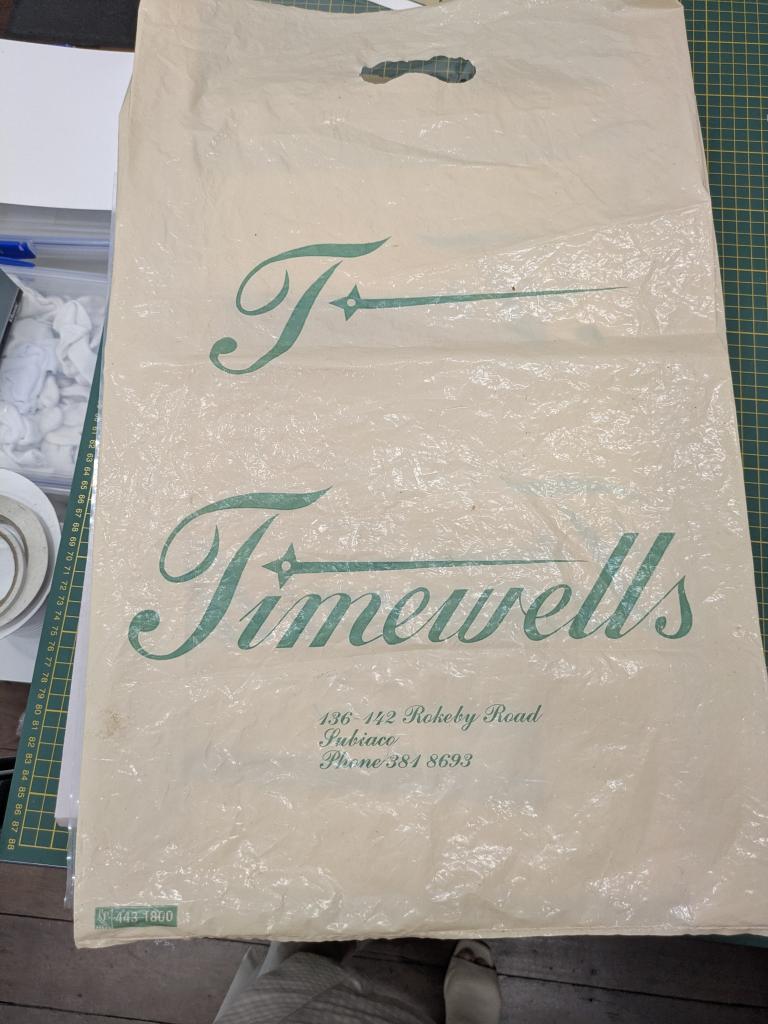 1952Cream plastic shopping bag with green writing. The has a large green 'T' at the top with 'Timewells' underneath. At the bottom is