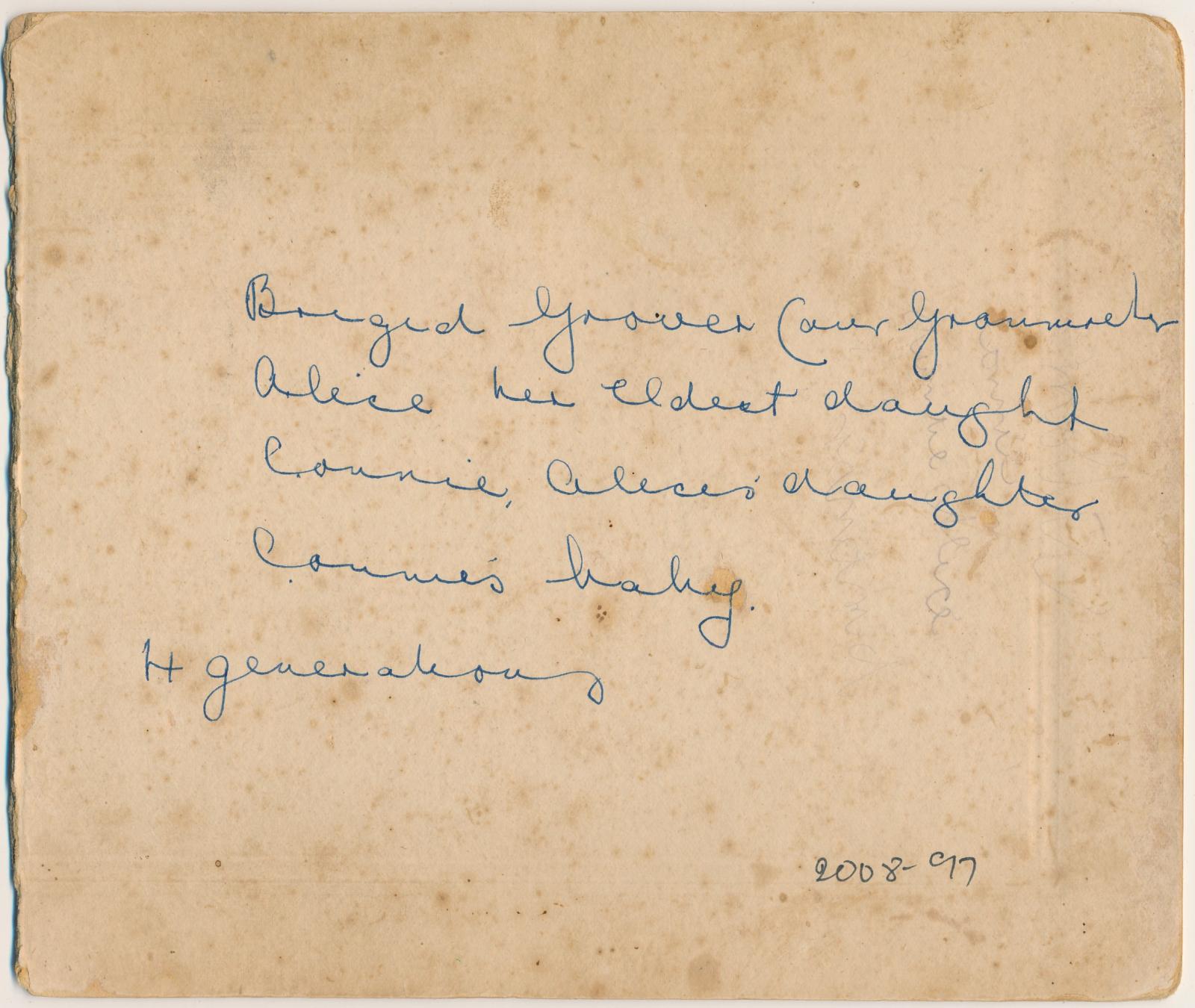 On the back of the photograph handwritten in blue ink is "Bridget Grover(our Grandmother Alice her eldest daughter Connie, Alice's daughter Connie's baby 4 generations".