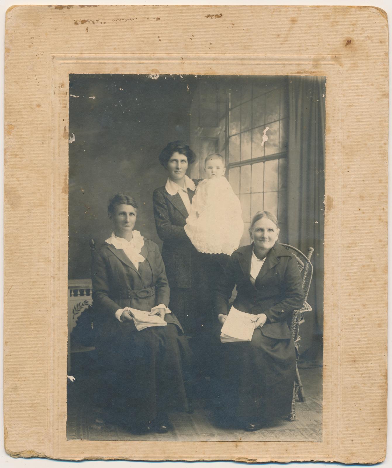 c. 1900A black and white photograph of four women, two are seated, one is standing at the back holding a baby. The women are all wearing long dark skirts and long dark jackets.