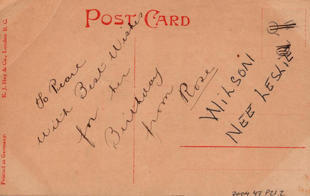 Reverse: Written in black pen 'To Pearl with best wishes for her birthday from Rose' and 'WILSON NEE LESLIE'