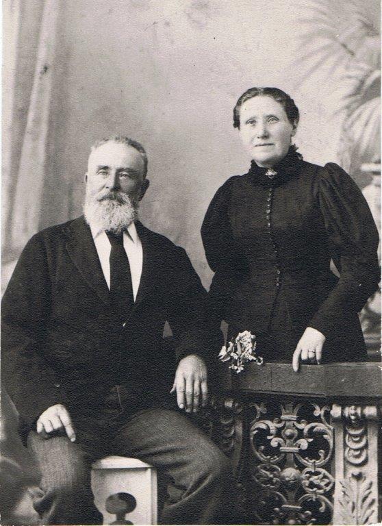 c. 1905B/W Print. (a) Studio portrait of James Good Caporn and his wife Sarah. A bearded man, he is dressed in white shirt, dark tie and jacket and lighter trousers, and is seated on a wooden stool. His right arm is resting on top of a iron lace balustrade behind which Sarah is standing. A solid woman with hair drawn back, she is wearing a dark, boned bodice and skirt. The bodice has full sleeves, is front buttoned and has a high neck finished with a brooch. A backdrop with palms is behind them. (b) Handwritten on the rear [Sarah Tonkin with her husband/ James Good Caporn./ Parents of Edith Grace Caporn/ Grandparents of Peter John Mews]. And in a different hand [Great Grandparents of/ Christopher John Mews/ Great Great G Parents of/ Thomas and Juanita Mews].