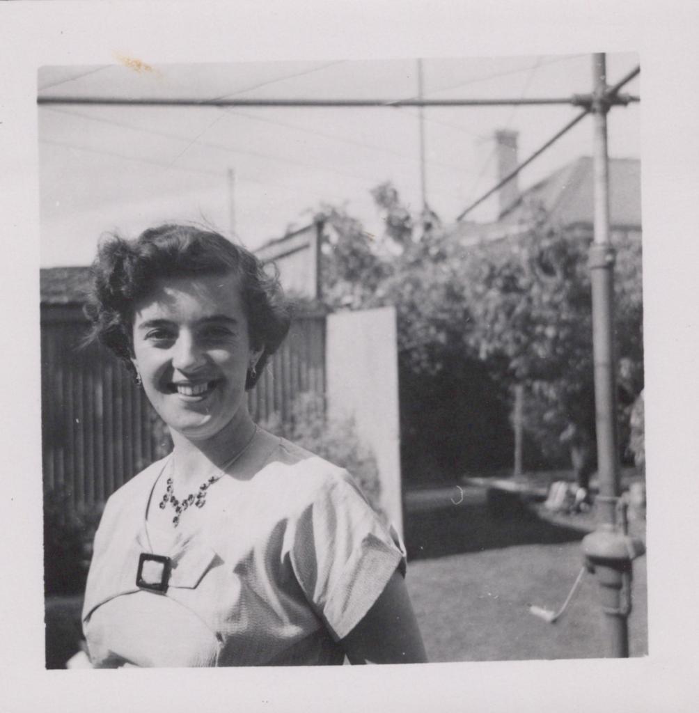 c. 1910Image: A photograph of a Dorothy Trenberth standing in a backyard, under a hills hoist. She is wearing a short sleeved white dress that has a buckle across the chest, and a nacklace. Behind Dorothy is grass, a fence and some vegetation.