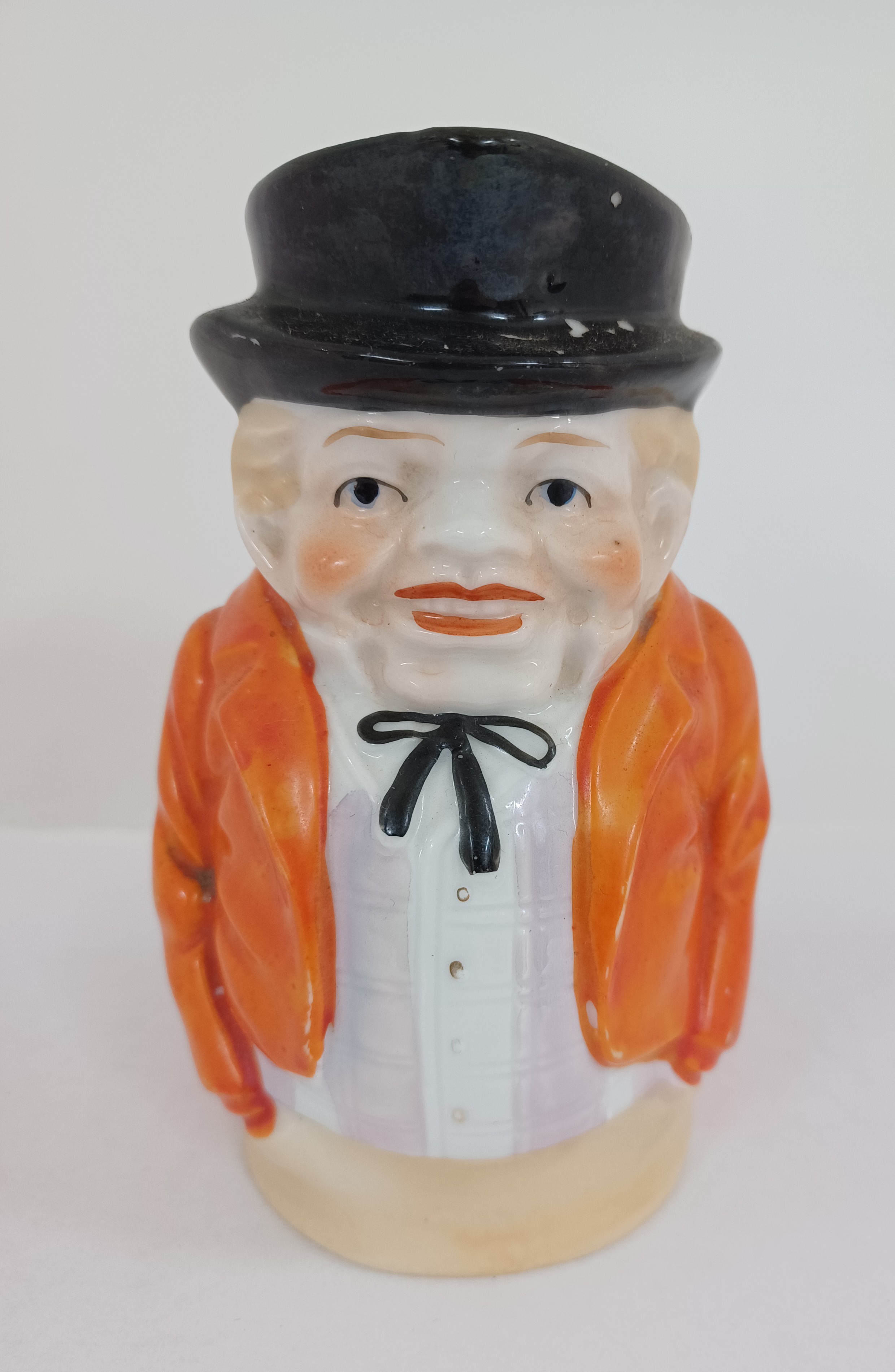 A colour milk jug with handle of a man in a black bowler hat, orange waist coat, black tie, white striped shirt and his hands in pocket