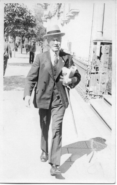 B/W Print. William Mansbridge in light felt hat, double breasted, three piece suit, shirt and tie, striding along the footpath, pipe in mouth, cane swinging and papers under his arm. In the background are pedestrians and street trees and on the right the steps to a building with a rough stone pillar and iron railings.