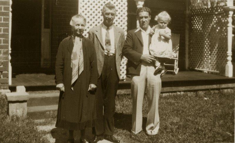 c. 1936B/W print. (a) Emily Cooper, in long dark frock and light scarf, with son Bert wearing dark pants and light jacket, and grandson Max in dark suit with his son John, a small boy in romper suit. They are standing in front of the steps to a verandah. There is fretted brickwork on the left and lattice panels at the end and front of the verandah where there is a rocking chair. (b) Emily Cooper with son Bert, grandson Len and his baby daughter Nancy.