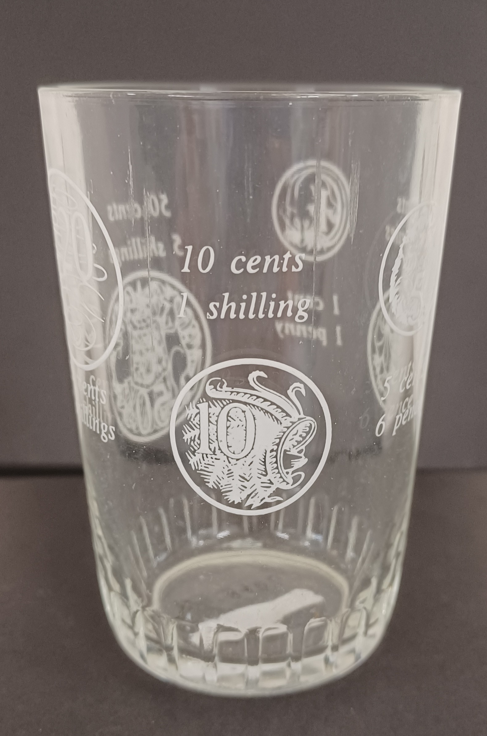 1966Clear glass tumbler with a white transfer showing decimal coin currency and equivalents in pre-decimal currency. . The glass has straight sides and a slightly fluted pattern around its base.