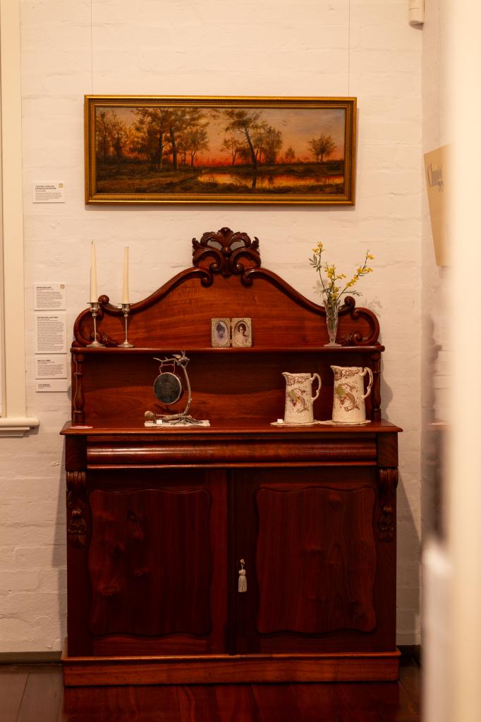 c. 1870Light brown side board with varnished surface. Attached to top of chest is a flat board with ornate embossed edges and a headpiece. A wooden shelf with flower outline is attached to the board and is supported by two ornate rounded posts. The lower half is flat topped with one drawer the width of the chest and underneath two doors with embossed irregular square design. Right and left sides of the chest underneath the drawer have an embossed ornate design with flowers in half relief. Item number is marked at the back.