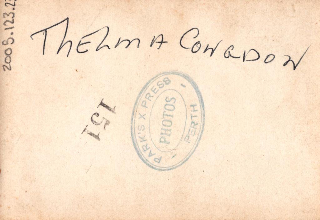 Reverse: Handwritten in black pen is 'THELMA CONGDON'. There is a faint blue stamp 'PARK'S X PRESS PHOTOS PERTH' and a number stamped in black, '151'.
