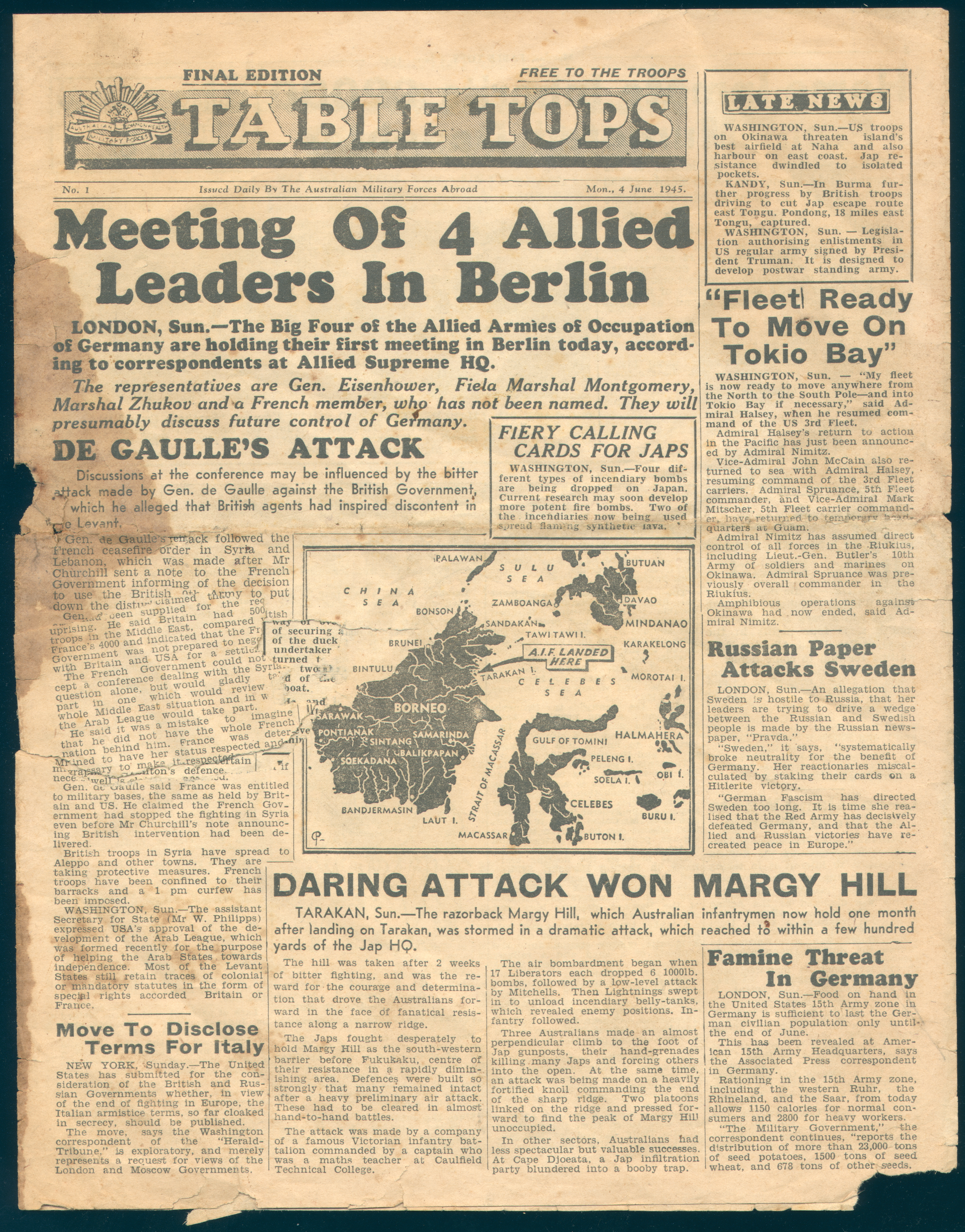 “FINAL EDITION / FREE TO THE TROOPS / TABLE TOPS / No 1 / Issued Daily By The Australian Military Forces Abroad / Mon.,4 June, 1945”
