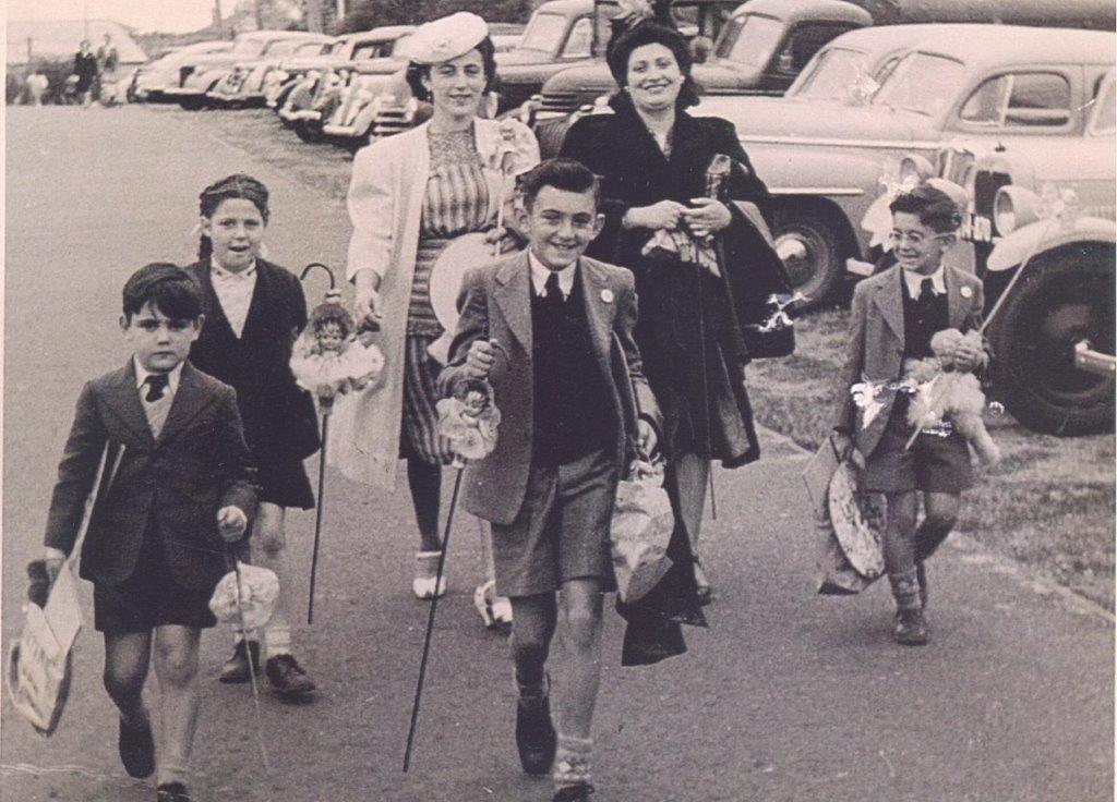 1948B/W prints. (a) Mrs Kathleen Manolikos with her son Louis and daughter Margaret inside the turnstiles at the main entrance to the Claremont Royal Show. Mrs Manolikos, in summer frock and light weight coat, white hat and shoes is carrying a white purse. Louis is wearing dark pants, jacket and beret and patterned jumper: Margaret a summer's frock, hat and cardigan. There are several men in suits and hats the background and in the turnstiles. (b) Mrs Manolikos, Louis and Margaret, and Mrs Anastasia Zafer with sons Nick and Harry leaving the Show with show bags and decorated walking sticks. Mrs Manolikos is in light summer outfit and Mrs Zafer in dark frock with black coat and black hat. The three boys are in tailored suits, vee neck jumpers and ties and Margaret in dark skirt and jacket. They are on the road with cars parked at right angles on the verge.