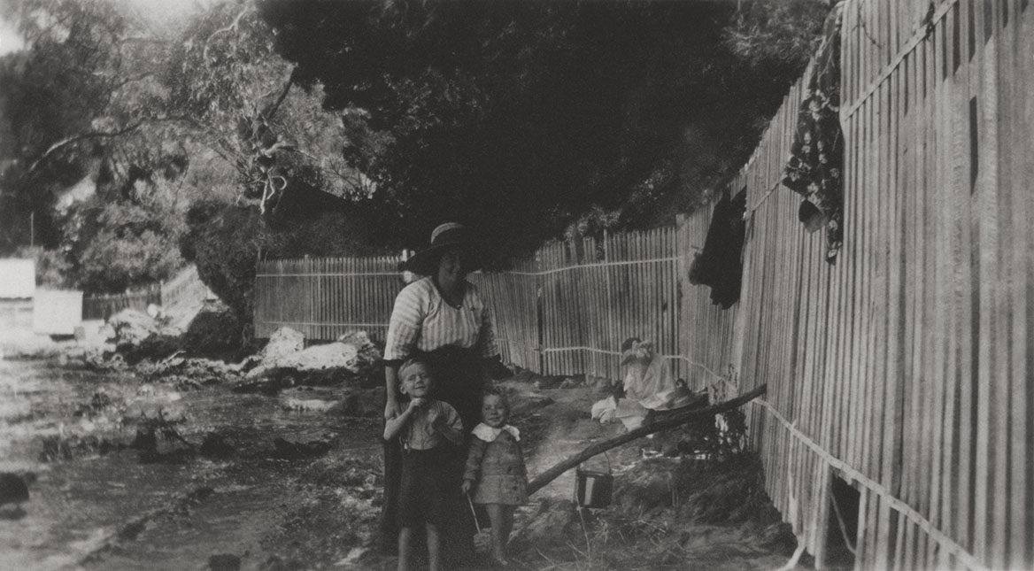 Edith Shaw in large hat and light frock with son George James Shaw and daughter Sarah Olive Shaw, standing next to a fire with a billy suspended over it from a length of wood hooked in the fence.