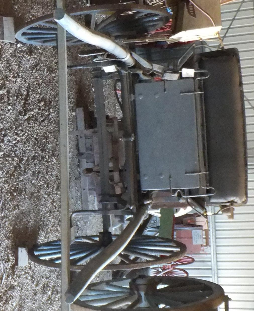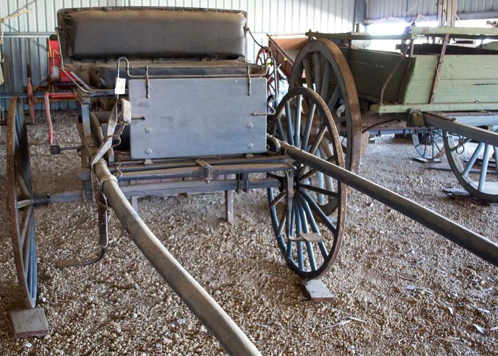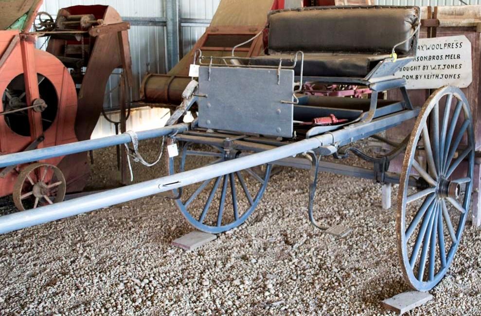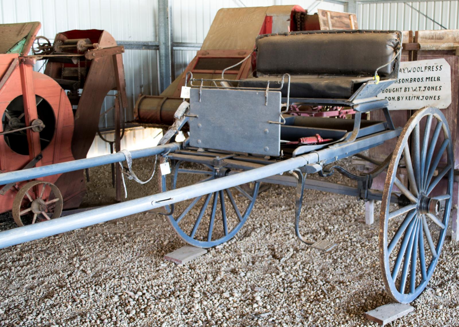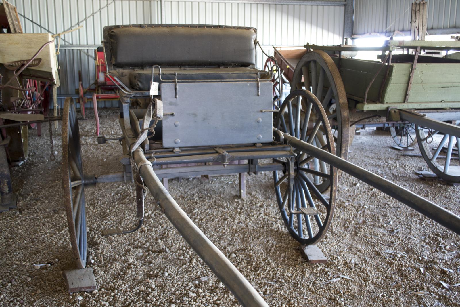 Rebuilt by Mr Denis O'Halloran . Ironworks from E. Hornby's old sulky, axle hubs from Harry Pearson's buggy. Built as near as possible to original design. Bodywork of pine and jarrah, wheel spokes of mallet, Felloes of tingle and shafts of karri. Seat is upholstered as they mostly were. Reconstructed by Mr O'Halloran using some original parts.