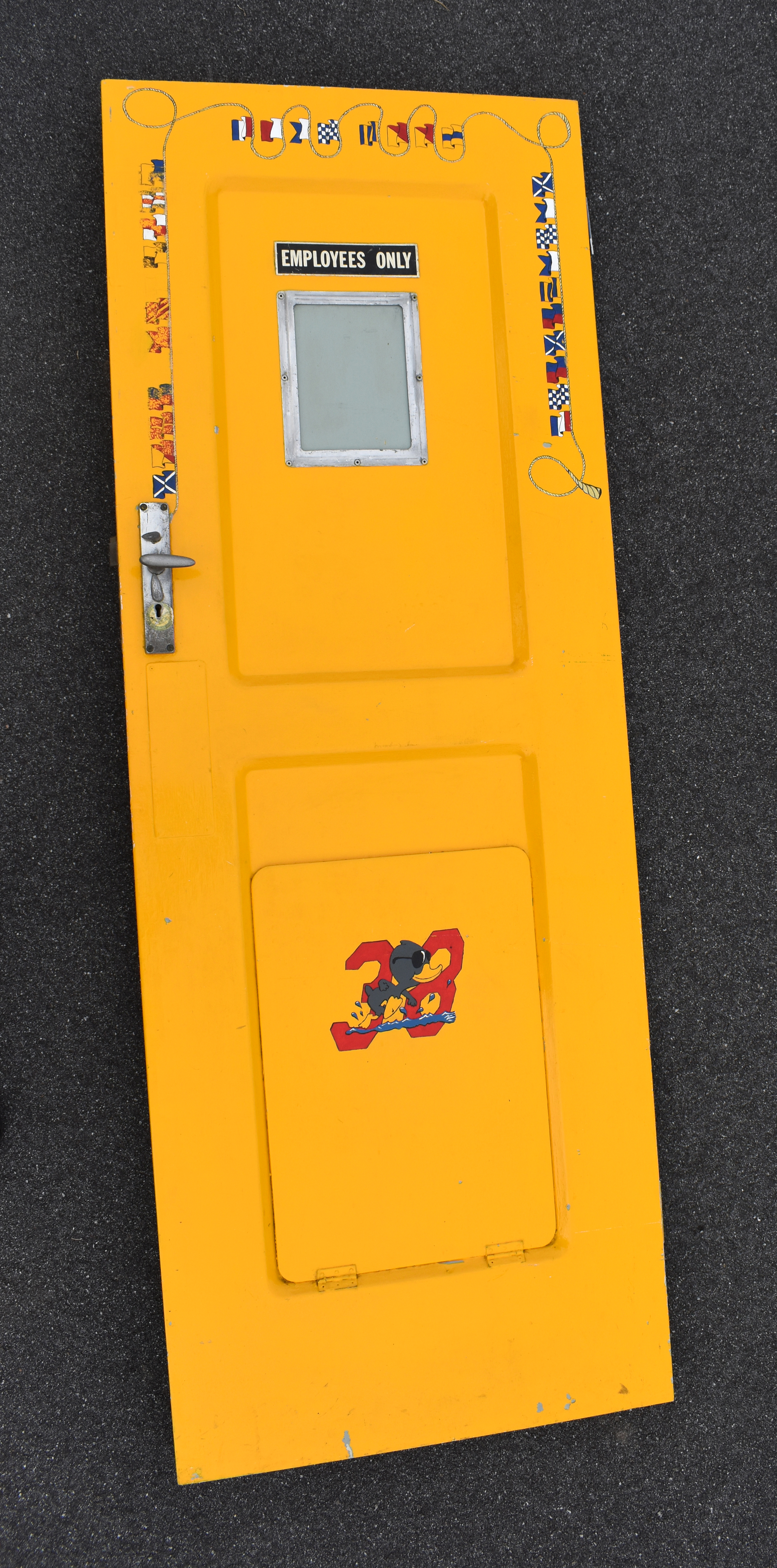 c. 1965Features painted international maritime signals flags around top half which says 'MORE by luck than good management' plus has a characture of small swan wearing sunglasses walking on water infront of a '38' on a yellow painted wooden door. A rectangular sign fixed to front reads 'Employees Only' above a metal information sign.