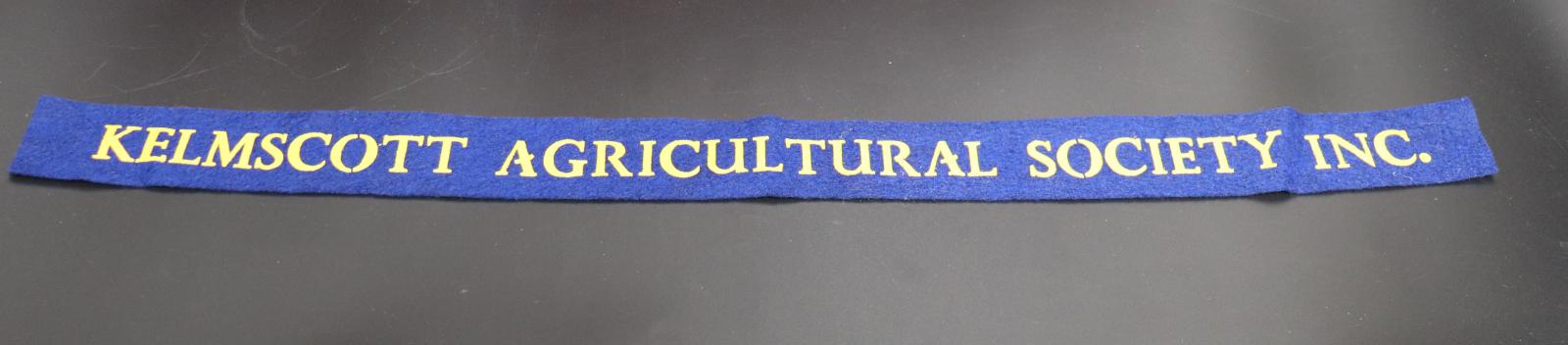 c. 1990 - 1999A length of blue felt material forming a ribbon for awarding as a prize. Printed on the ribbon, in yellow ink, is [KELMSCOTT AGRICULTURAL SOCIETY INC.].