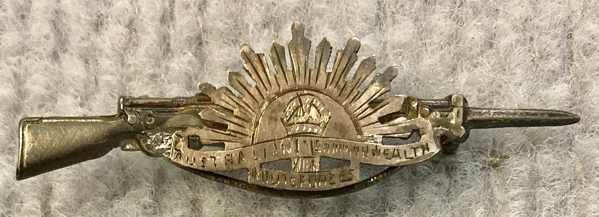 Sweetheart brooch with Rising Sun badge attached to rifle and bayonet