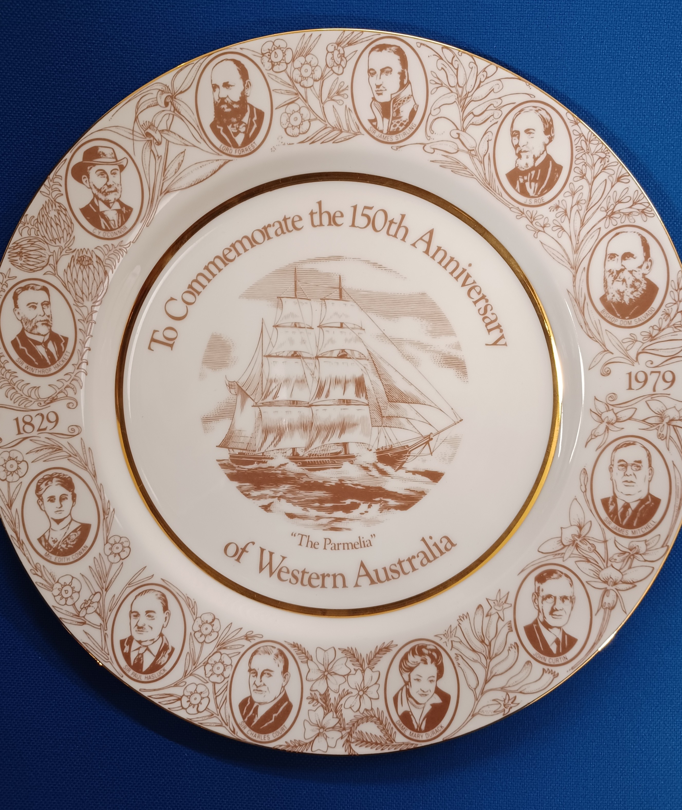 1979large cream coloured dinner plate features a central illustration of the ship 'Parmelia' surrounded by portraits of twelve well-known Western Australians with a floral border decoration.