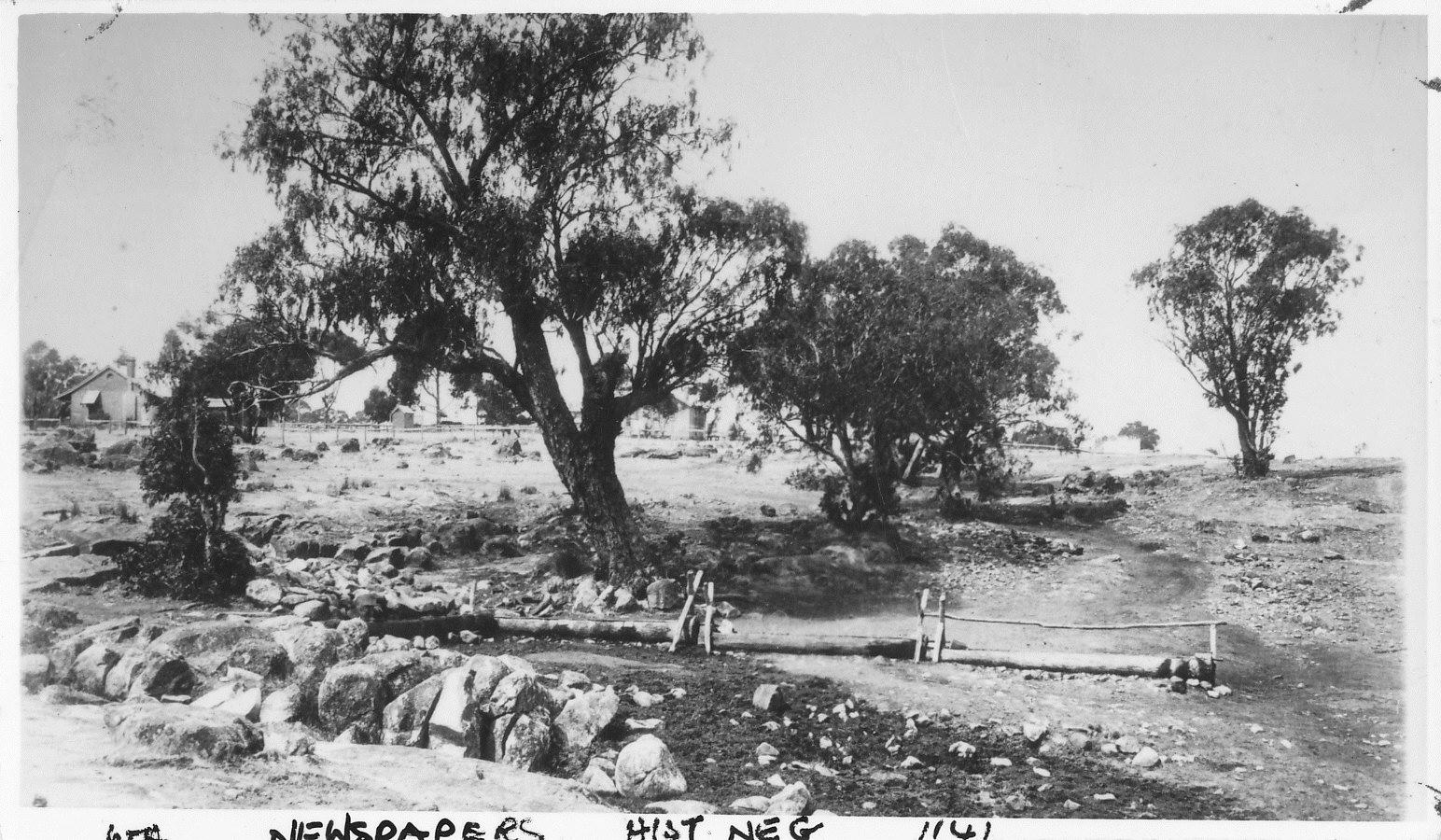 Early water supply, Kojonup Hollow log troughs were for summer watering of stock Near the Spring - note Old Post Office in the distance